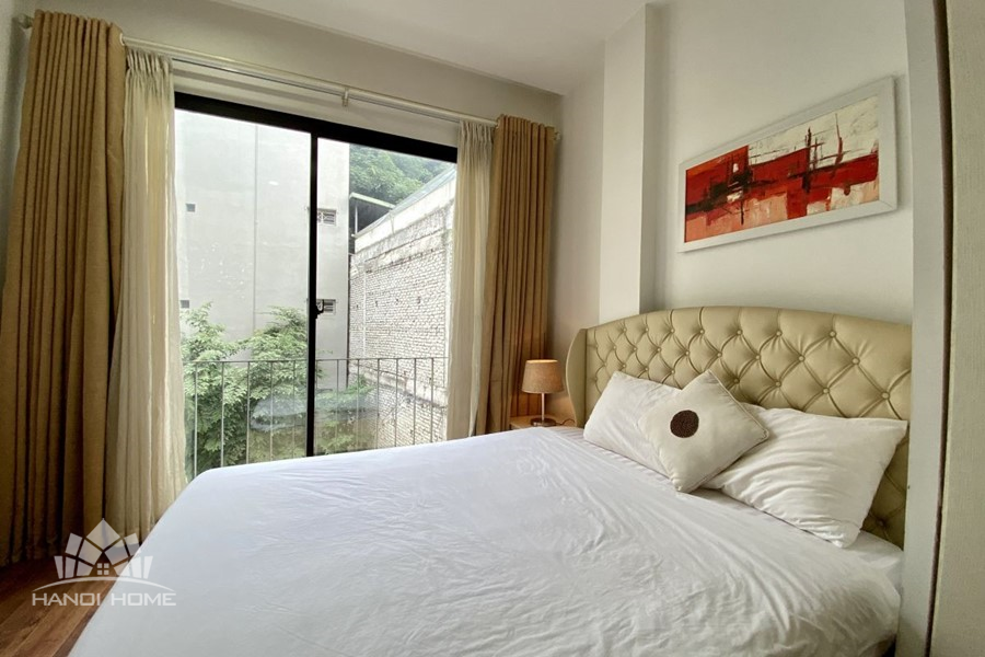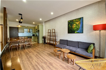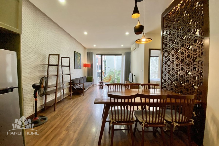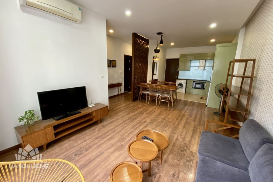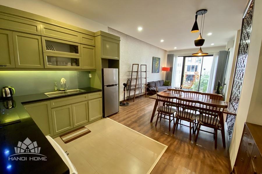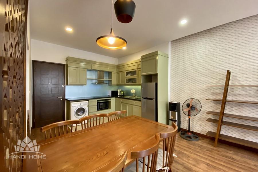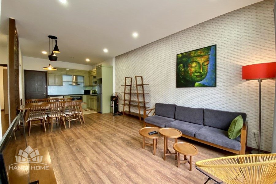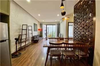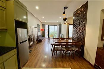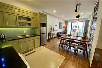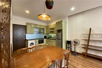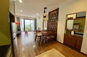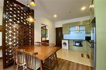 This elegant 2-bedroom apartment is ideally located on To Ngoc Van street in Tay Ho, making it a perfect choice for convenient and relaxing living. The apartment's standout feature is its modern design, which maximizes light with large, floor-to-ceiling sliding glass doors in both the living room and bedroom, ensuring the space is constantly flooded with natural light and offers a pleasant green view. The furniture is carefully selected in a cozy style, highlighted by continuous wooden flooring and natural wood accents, such as the large dining table set and a sophisticated, Asian-inspired carved wooden partition. The modern open-plan kitchen features unique olive green cabinets and is fully equipped with appliances. The main bedroom utilizes cream/white tones, a luxurious tufted headboard, and large built-in wardrobes. With its perfect combination of a prime location, smart open design, and tasteful interiors, this is an ideal living space for anyone seeking comfort, convenience, and high aesthetic value in Tay Ho.