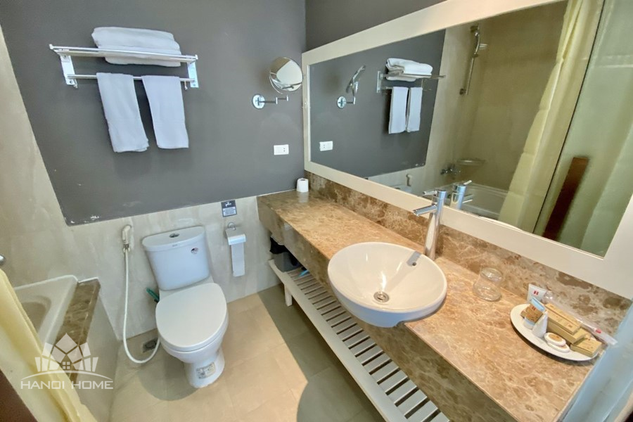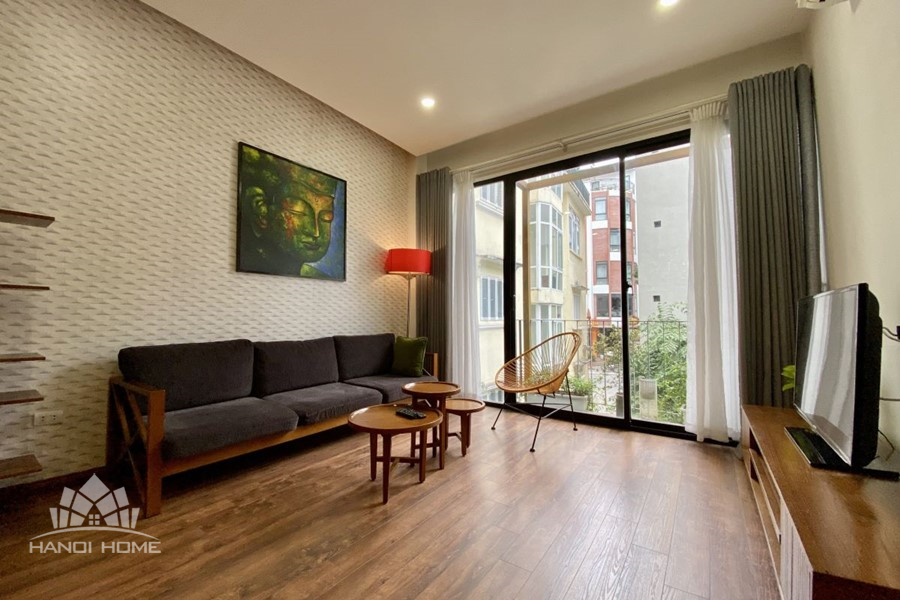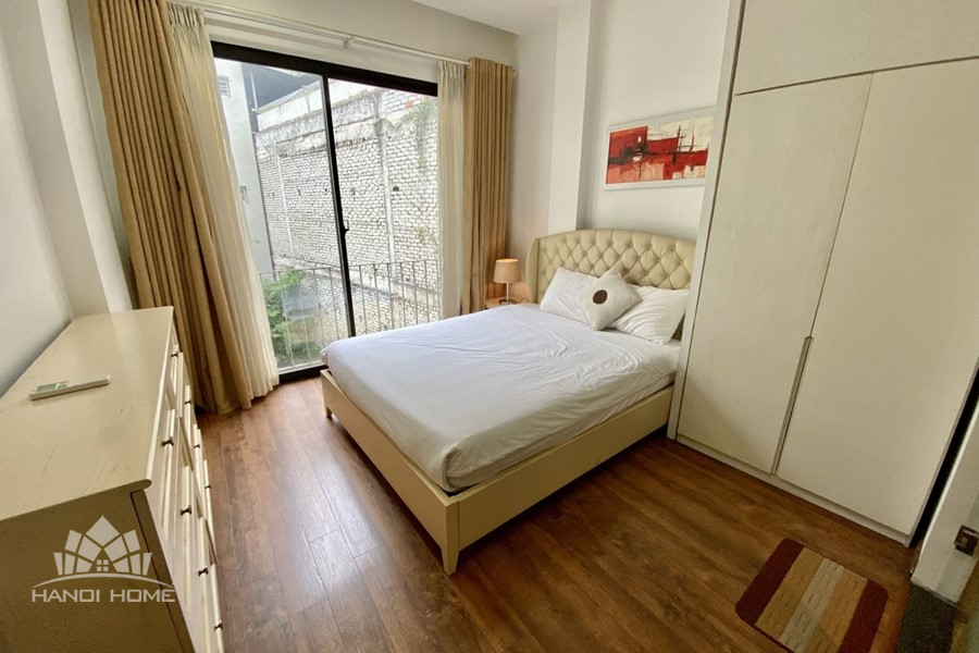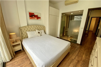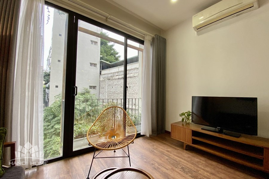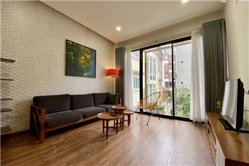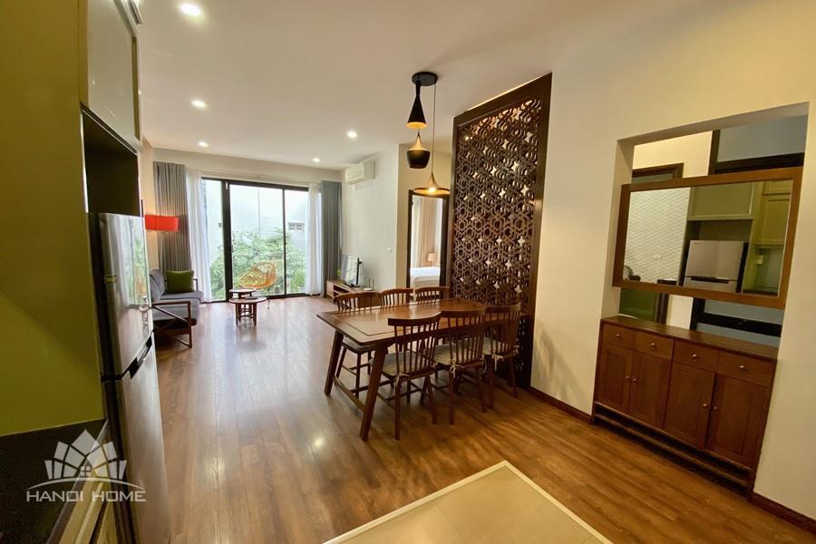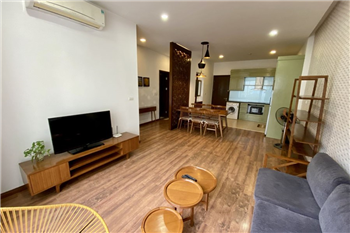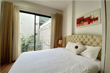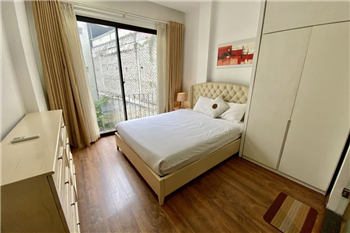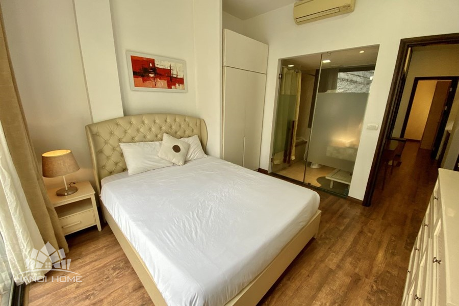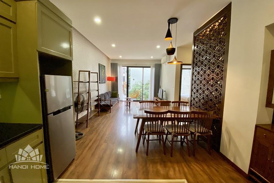This elegant 2-bedroom apartment is ideally located on To Ngoc Van street in Tay Ho, making it a perfect choice for convenient and relaxing living. The apartment's standout feature is its modern design, which maximizes light with large, floor-to-ceiling sliding glass doors in both the living room and bedroom, ensuring the space is constantly flooded with natural light and offers a pleasant green view. The furniture is carefully selected in a cozy style, highlighted by continuous wooden flooring and natural wood accents, such as the large dining table set and a sophisticated, Asian-inspired carved wooden partition. The modern open-plan kitchen features unique olive green cabinets and is fully equipped with appliances. The main bedroom utilizes cream/white tones, a luxurious tufted headboard, and large built-in wardrobes. With its perfect combination of a prime location, smart open design, and tasteful interiors, this is an ideal living space for anyone seeking comfort, convenience, and high aesthetic value in Tay Ho.