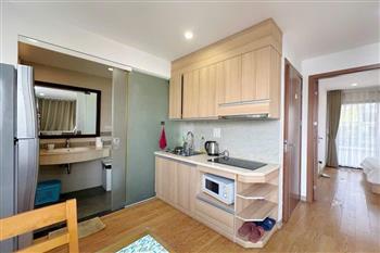 The living room and kitchen are arranged in an open-plan layout, maximizing the space. The living area includes a sofa and TV, seamlessly connecting to the compact kitchen, which is fully equipped. The bedroom is private and quiet, featuring a large double bed and crisp, clean linens.