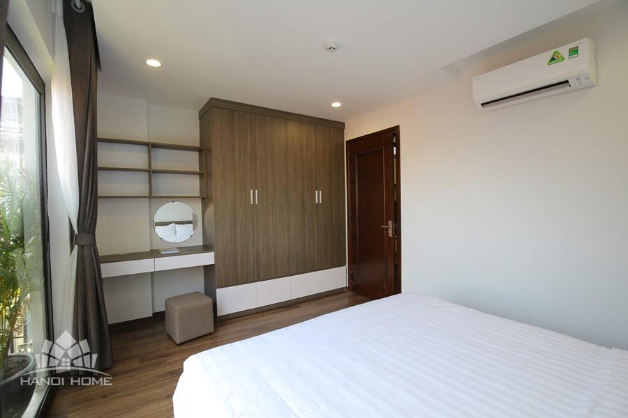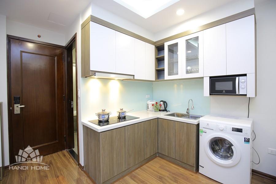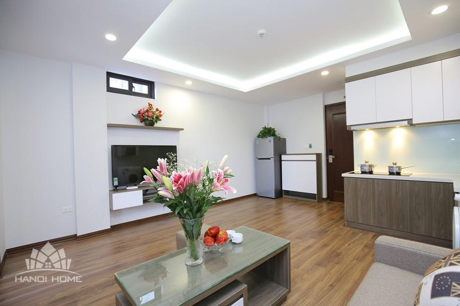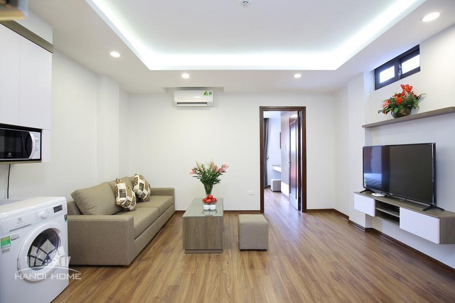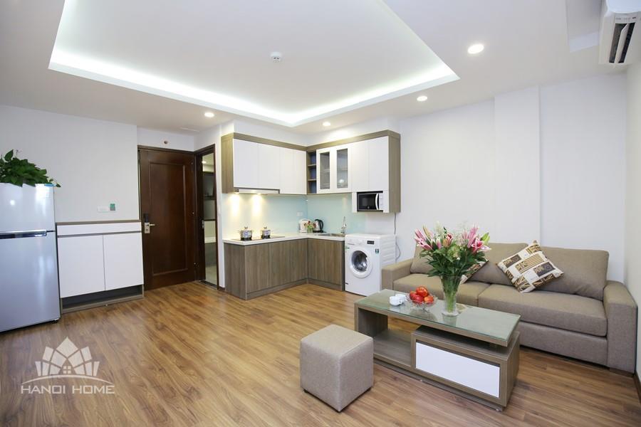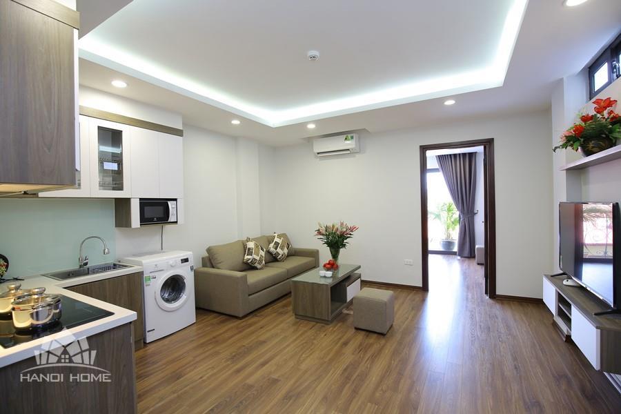 The apartment on Dao Tan Street, Ba Dinh, offers a modern and refined living space. Located in a central area near embassies and Thu Le Park, it provides not only convenient access to transportation but also a rare sense of tranquility and privacy in the heart of Hanoi. The apartment features a bright and elegant design, with a dominant color palette of white, cream, and light wood tones that enhance its sophisticated ambiance. Fully furnished with high-quality and coordinated interiors, including a premium sofa, coffee table, kitchen cabinets, washing machine, and modern electronic appliances, the apartment meets all daily living needs. The balcony allows residents to soak up the sunlight or enjoy a refreshing morning in the fresh air. This is an ideal choice for young professionals, expatriates, or small families seeking a comfortable, stylish home close to the city center.
