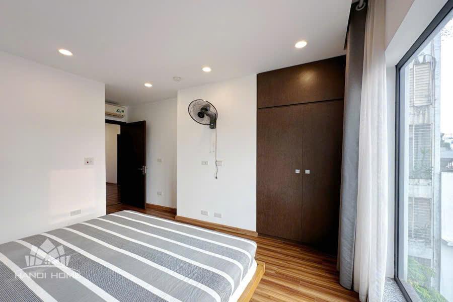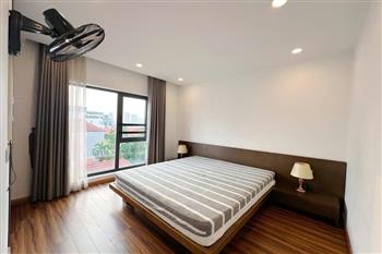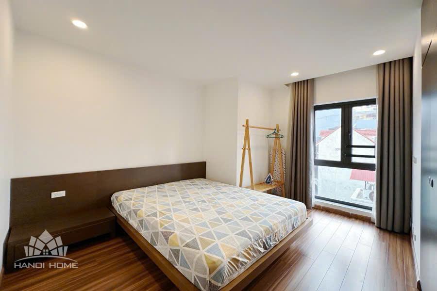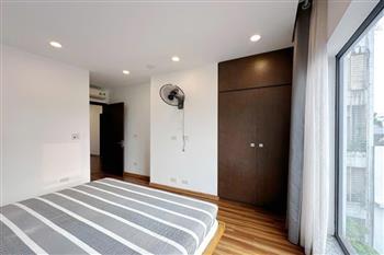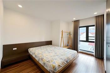 This modern two-bedroom apartment, located in the prime To Ngoc Van, Tay Ho area, offers an ideal living space filled with natural light. The common area is designed in an open-plan style, highlighted by shiny wooden floors and a dominant white color palette, creating a bright and spacious feel. The elegant living room, featuring a cream-colored L-shaped sofa and a large glass coffee table, benefits from two large glass balconies overlooking the neighborhood's diverse architecture, including red-tiled roofs. The cozy master bedroom boasts wooden flooring, a minimalist bed, and a conveniently designed headboard that extends into a storage ledge, complemented by a large window with dual-layer curtains.