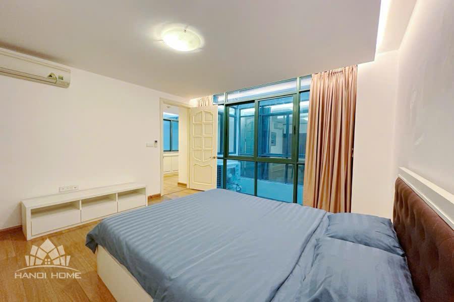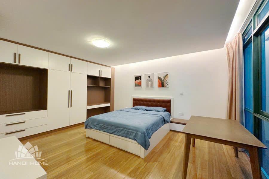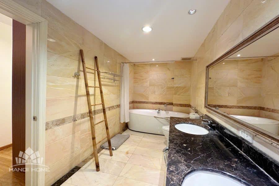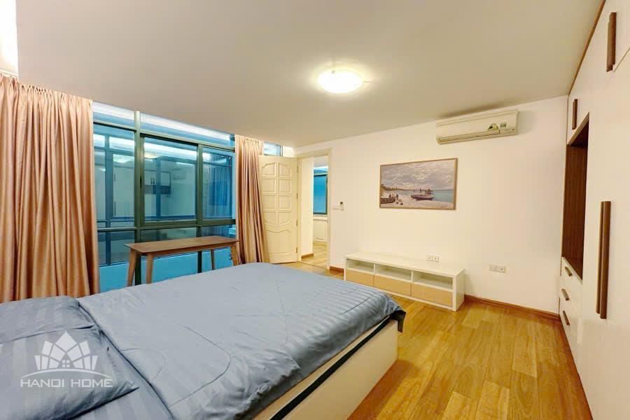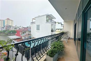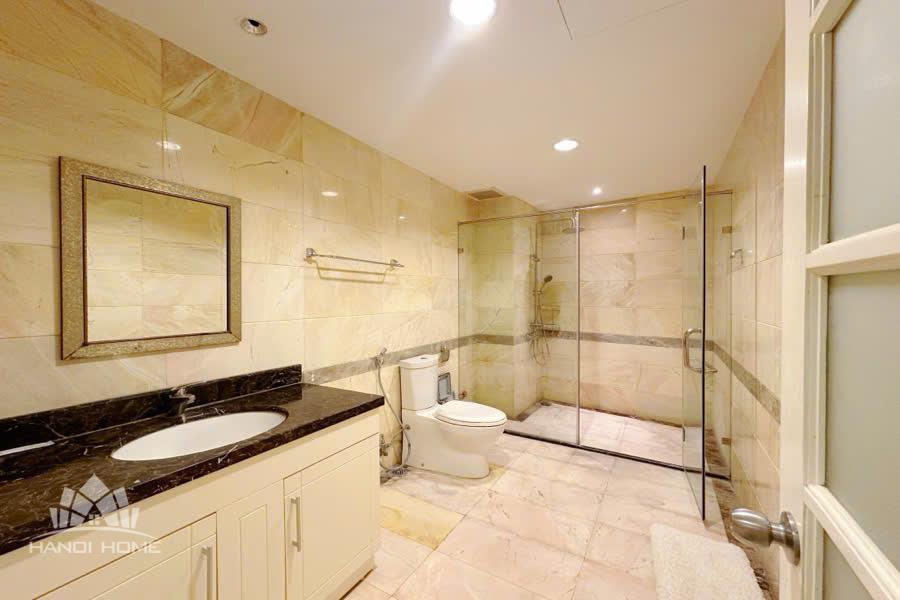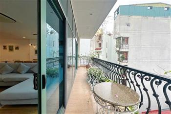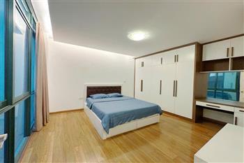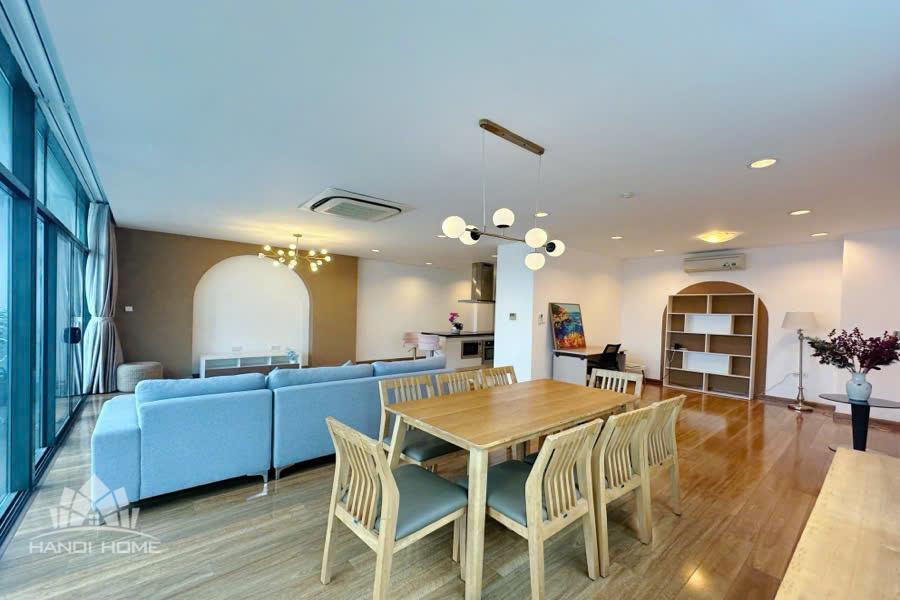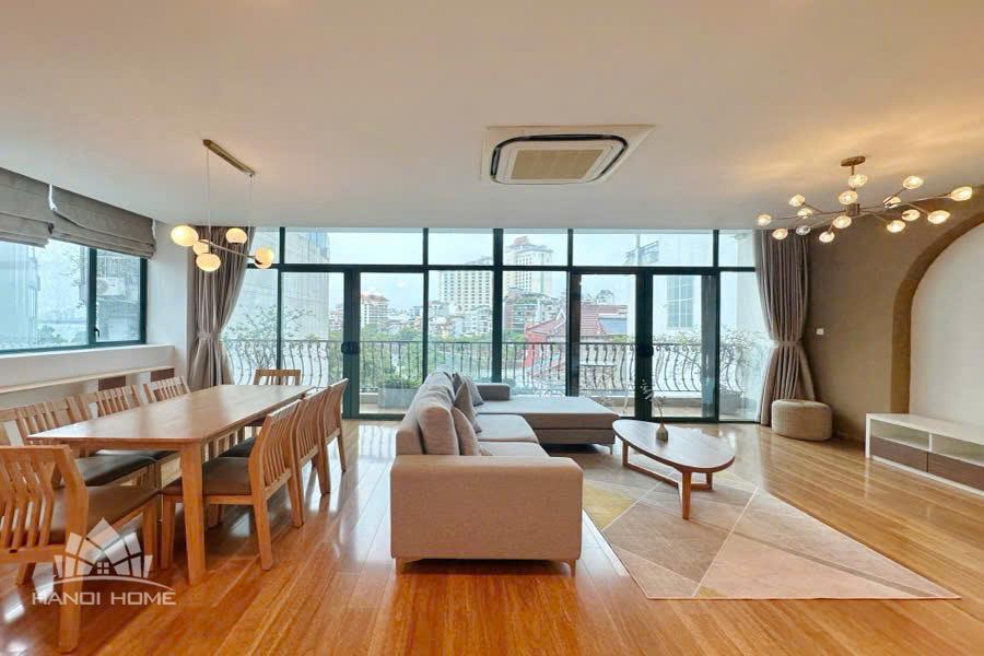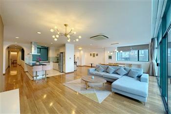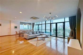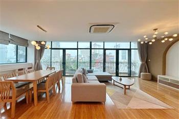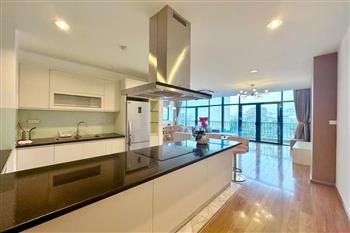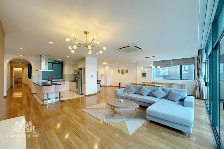 Located in a prime spot on Nam Trang Street, Ba Dinh, this 3-bedroom apartment offers a spacious and luxurious living environment. The apartment stands out with its modern open-plan design, gleaming wooden floors, and sophisticated lighting system. The extremely generous common living area flows seamlessly into the kitchen space. The modern kitchen, featuring white cabinetry, a large black granite island, and full appliances, is ideal for those who love cooking and entertaining. Notably, the apartment boasts a long balcony with expansive, floor-to-ceiling tempered glass doors, inviting abundant natural light into the unit and providing a relaxing spot to enjoy the city views. All three bedrooms are comfortably appointed, fully furnished, and benefit from natural light. This is the perfect choice for a family or professional seeking a convenient, stylish home with an incredible view in the central area.