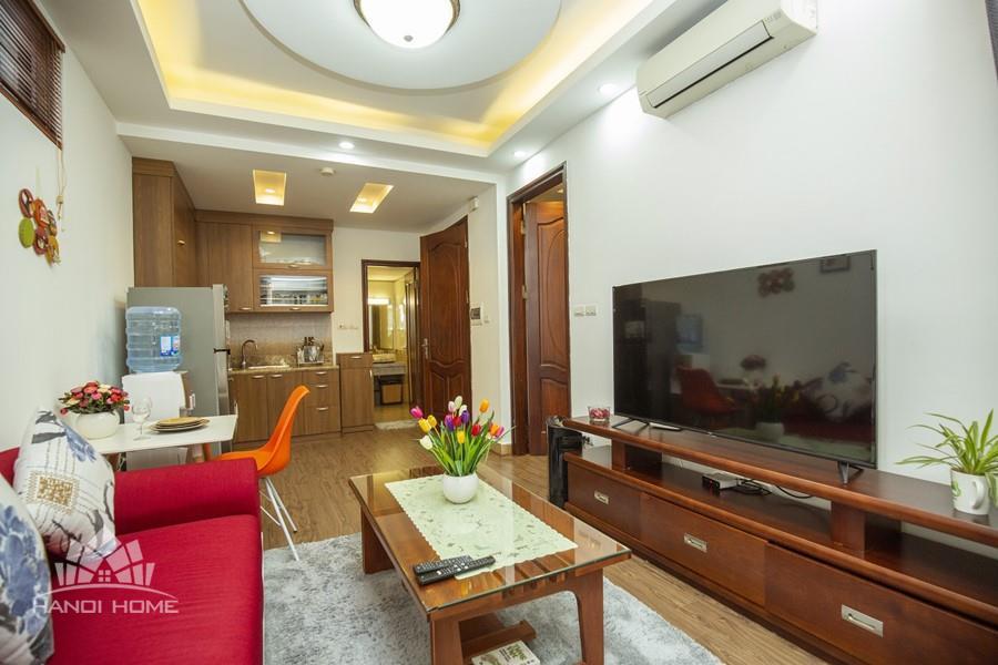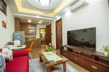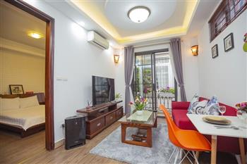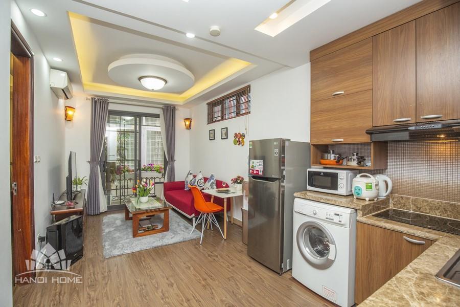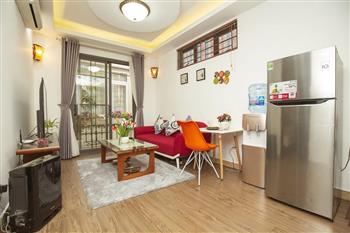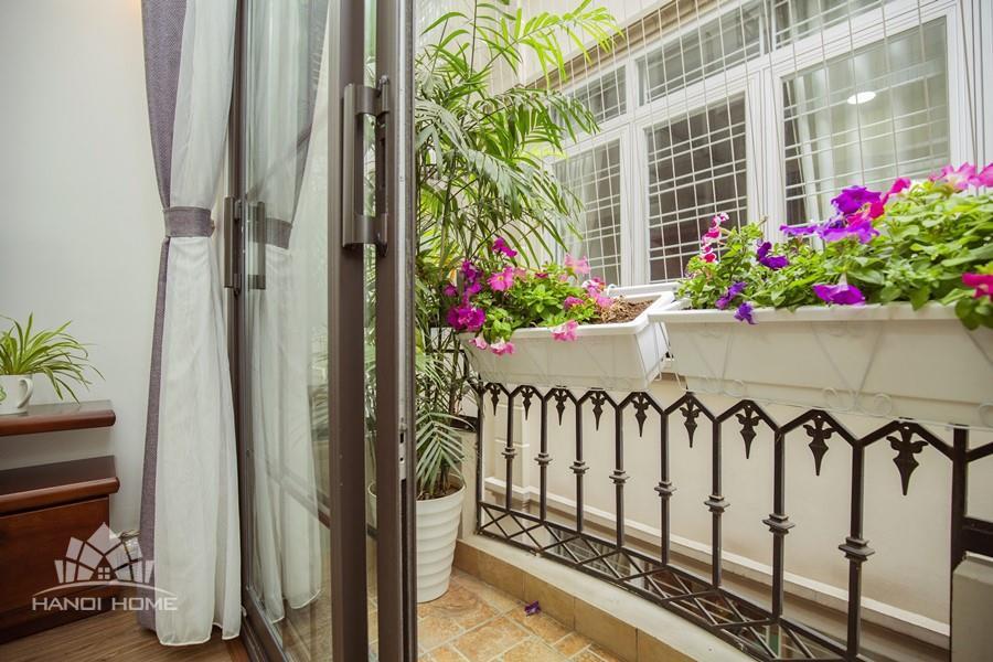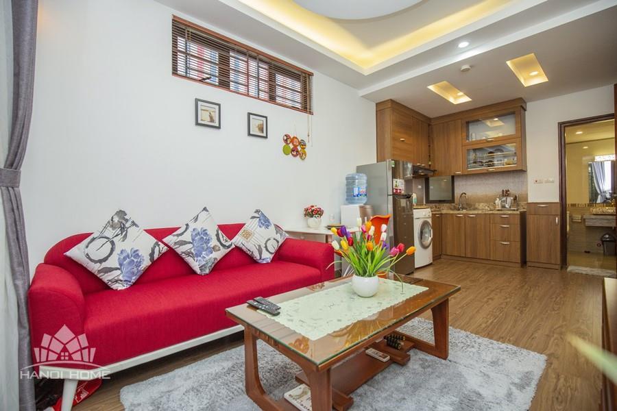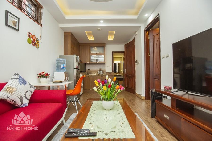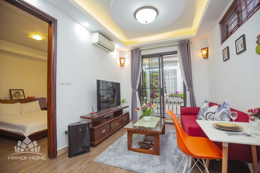 This 1-bedroom apartment, perfectly located in Dao Tan, Ba Dinh, is an ideal choice for anyone seeking a fully furnished living space at a great price right in the heart of Hanoi. The apartment is designed in a modern style with bright tones and warm wooden furniture, creating a cozy and relaxing atmosphere. The charming small balcony with vibrant fresh flowers and a large glass door, allowing natural light to flood the apartment, especially the living area.