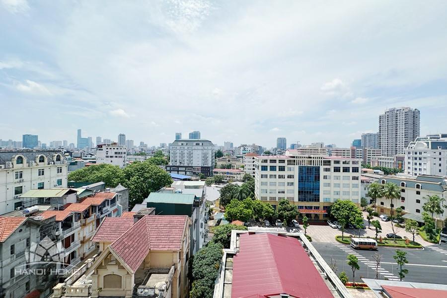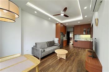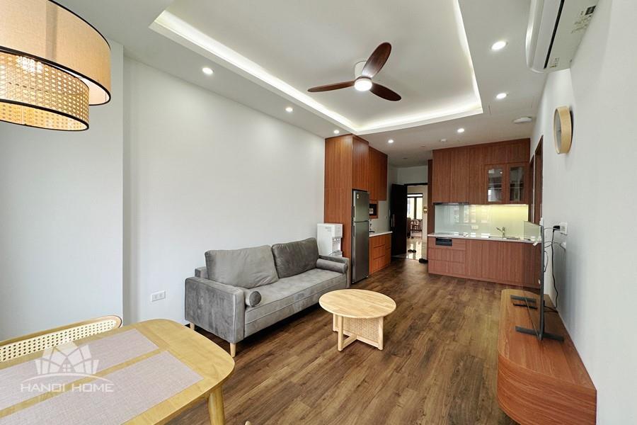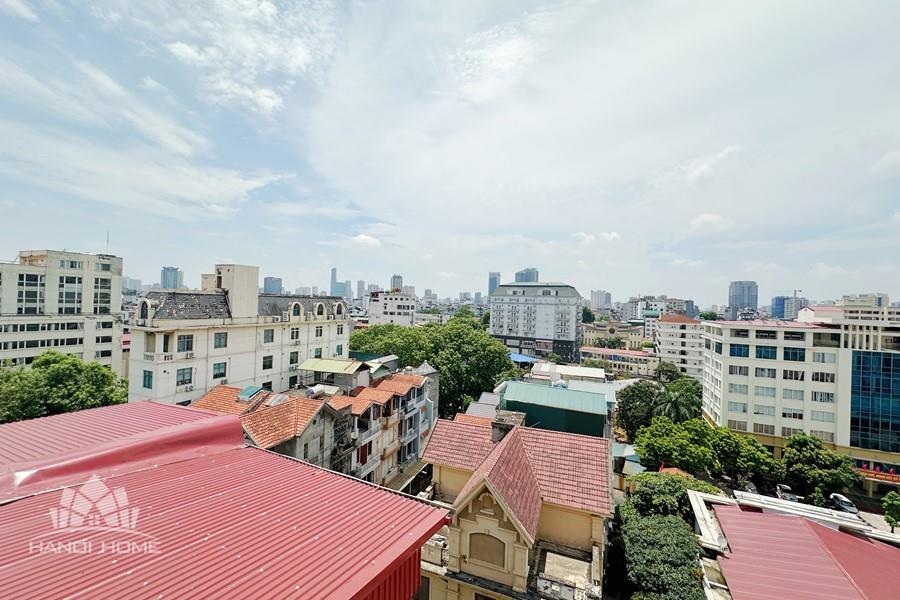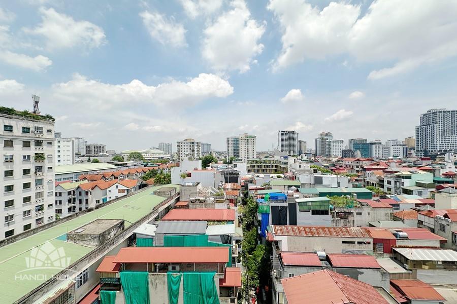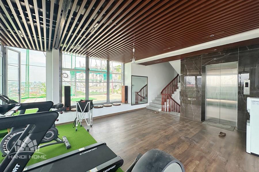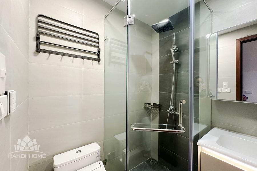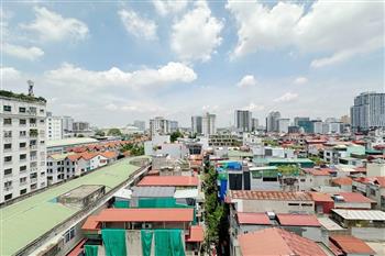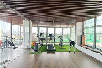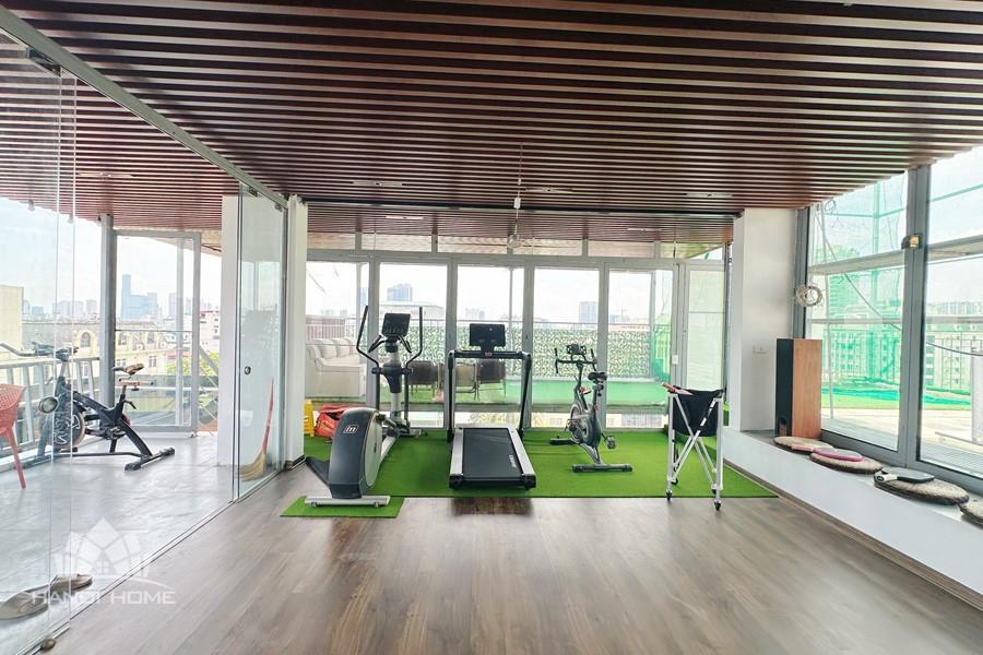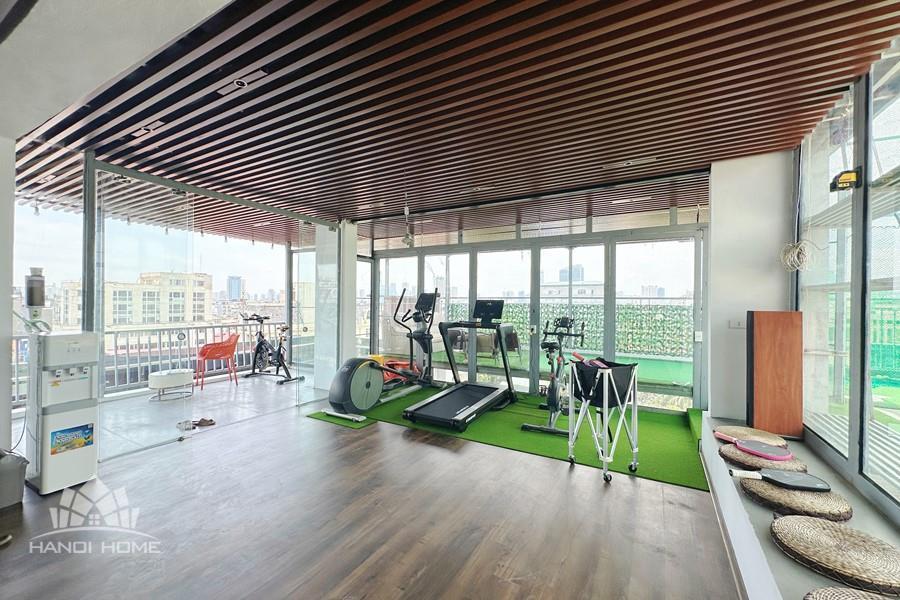 Recessed lighting and a ceiling fan enhance the contemporary ambiance. The bedroom is equipped with a cozy bed and built-in shelving, while a separate room provides a dedicated workspace with a wooden desk and wall-mounted air conditioning unit. The kitchen area is conveniently positioned near the living space and includes a refrigerator and essential appliances. On the rooftop, residents enjoy access to a spacious badminton court and a fully equipped gym, offering excellent recreational options without leaving the building. Located in the heart of Ba Đình, the apartment is close to major roads, cafes, supermarkets, and government offices, making it ideal for professionals, couples, or expats seeking a central and stylish home in Hanoi.