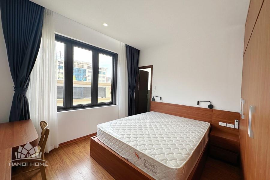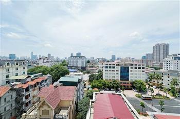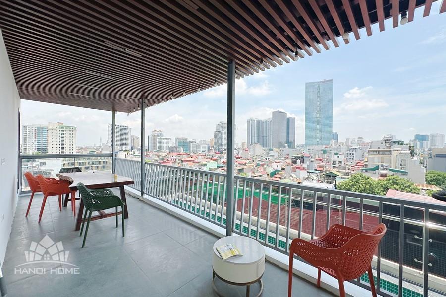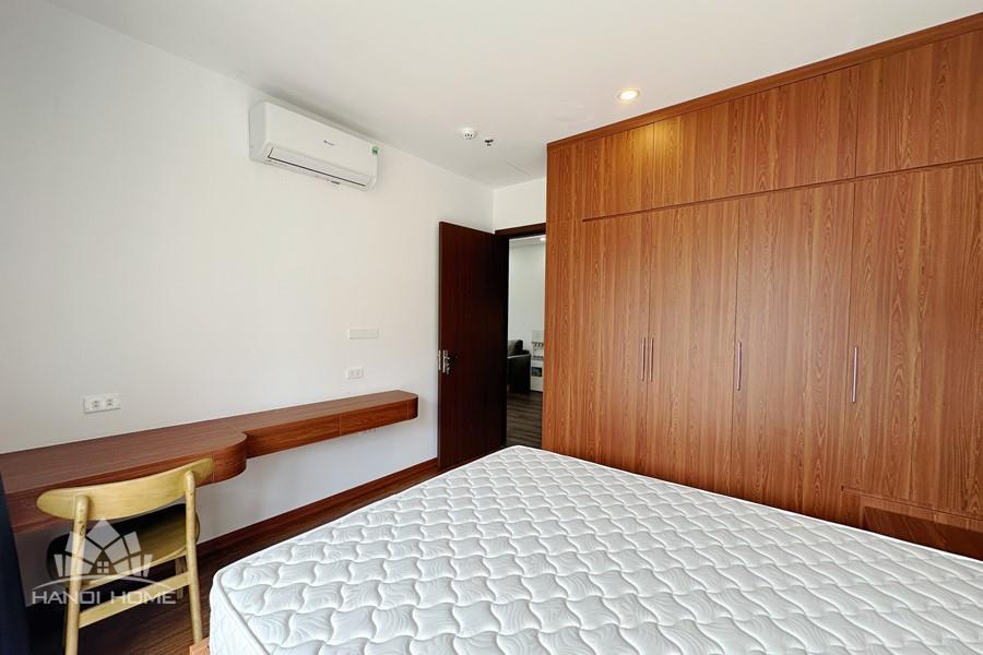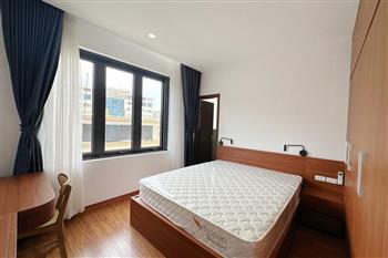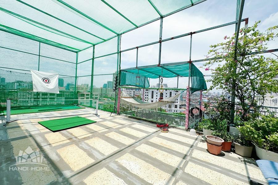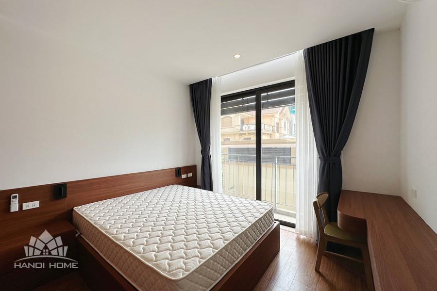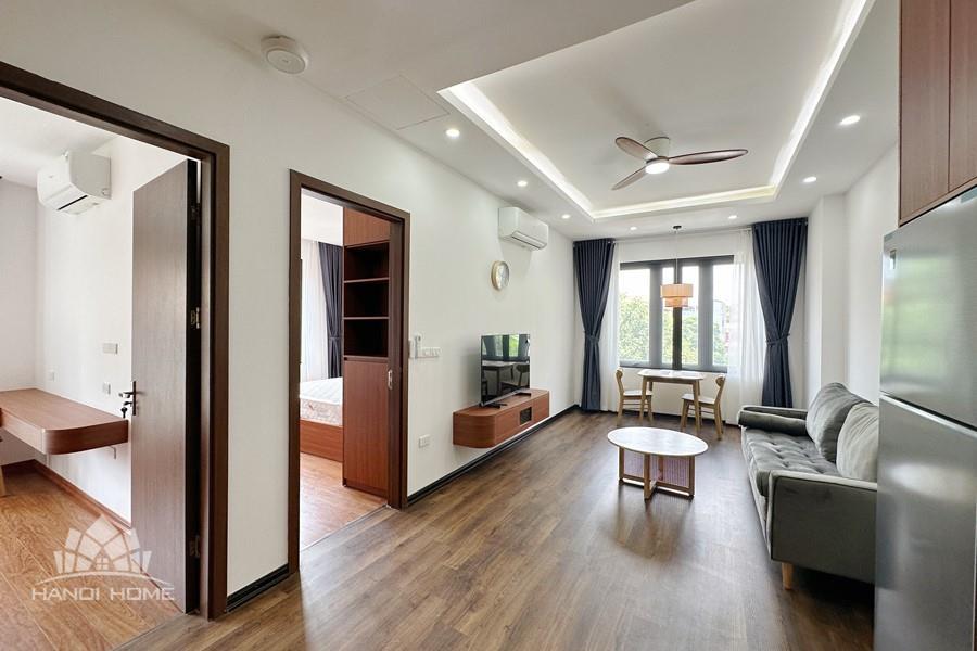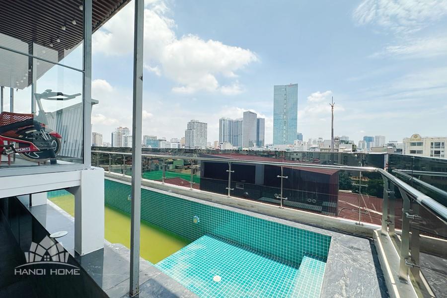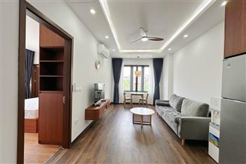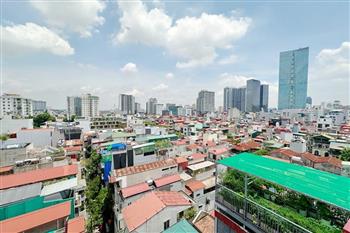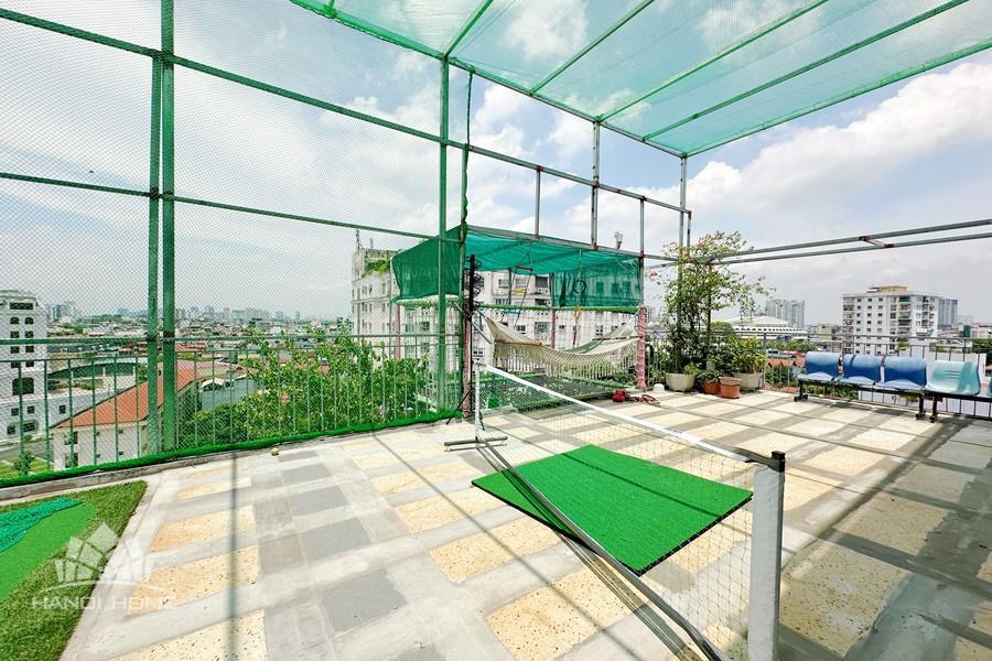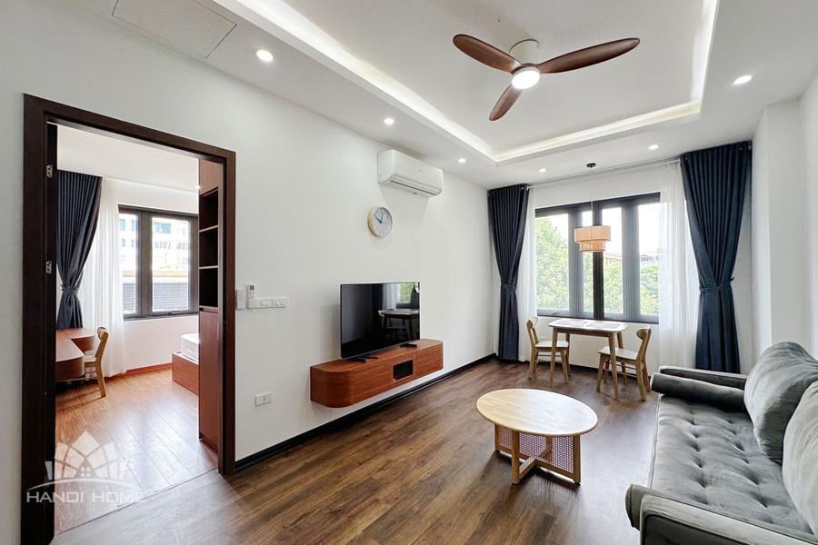 Recessed lighting and a ceiling fan enhance the contemporary ambiance. The bedroom is equipped with a cozy bed and built-in shelving, while a separate room provides a dedicated workspace with a wooden desk and wall-mounted air conditioning unit. The kitchen area is conveniently positioned near the living space and includes a refrigerator and essential appliances. On the rooftop, residents enjoy access to a spacious badminton court and a fully equipped gym, offering excellent recreational options without leaving the building. Located in the heart of Ba Đình, the apartment is close to major roads, cafes, supermarkets, and government offices, making it ideal for professionals, couples, or expats seeking a central and stylish home in Hanoi.