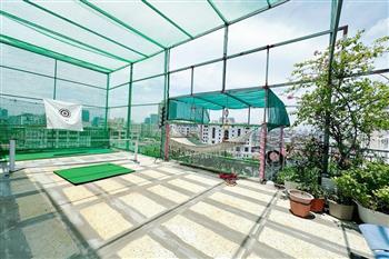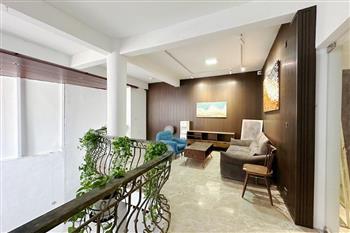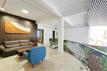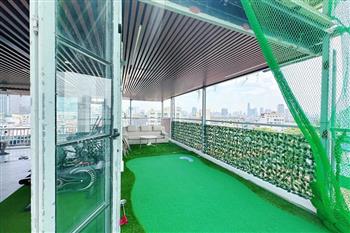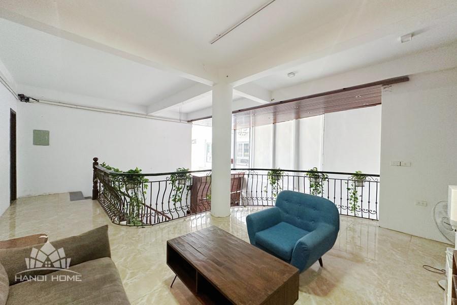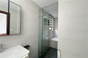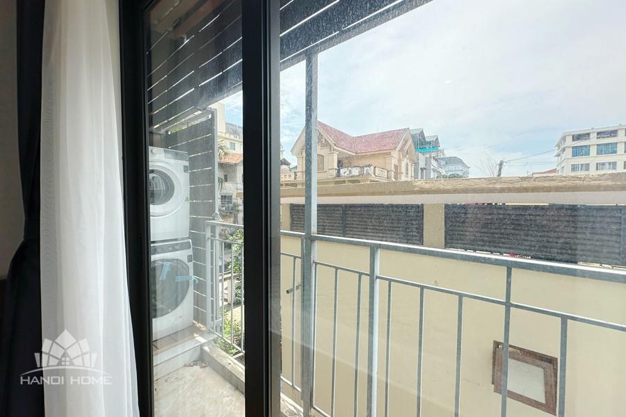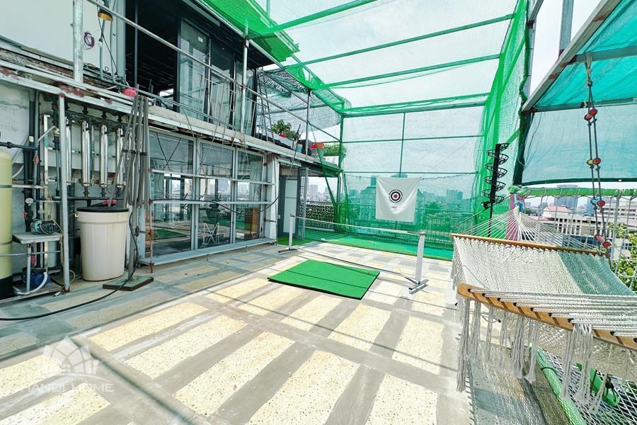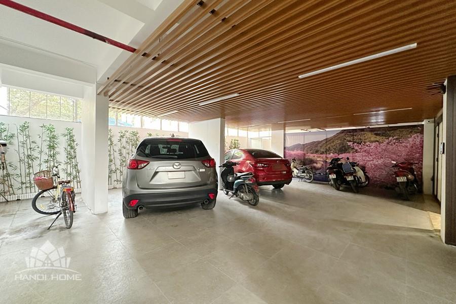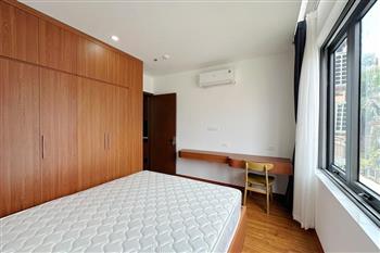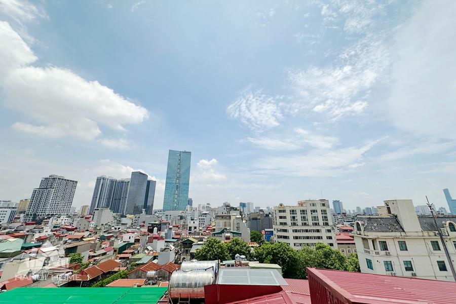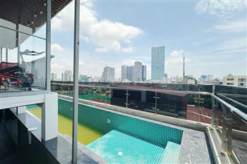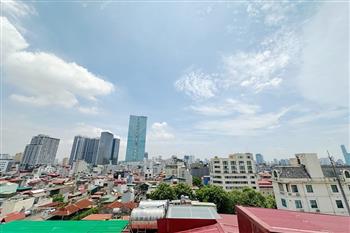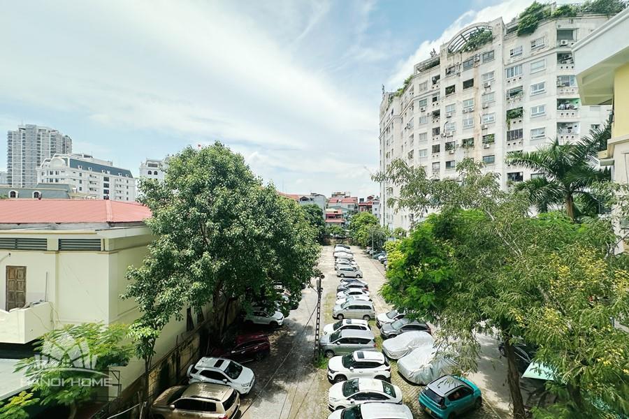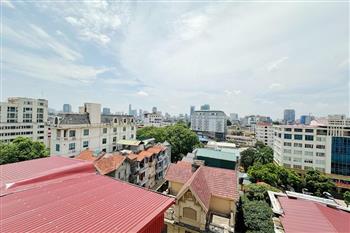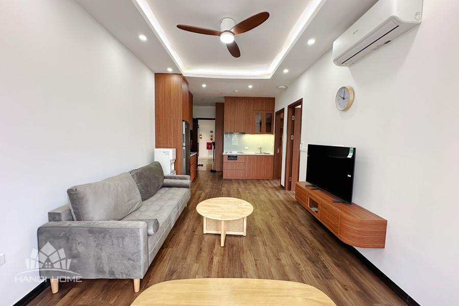 Recessed lighting and a ceiling fan enhance the contemporary ambiance. The bedroom is equipped with a cozy bed and built-in shelving, while a separate room provides a dedicated workspace with a wooden desk and wall-mounted air conditioning unit. The kitchen area is conveniently positioned near the living space and includes a refrigerator and essential appliances. On the rooftop, residents enjoy access to a spacious badminton court and a fully equipped gym, offering excellent recreational options without leaving the building. Located in the heart of Ba Đình, the apartment is close to major roads, cafes, supermarkets, and government offices, making it ideal for professionals, couples, or expats seeking a central and stylish home in Hanoi.