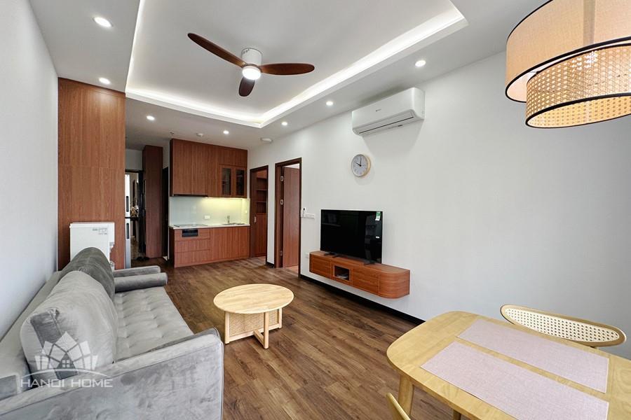 Modern two bedroom apartment located in Đội Cấn, Ba Đình offers a refined living experience with natural hardwood flooring throughout and a clean, minimalist design. The open-plan living room features a comfortable gray sofa, a round wooden coffee table, a flat-screen TV on a sleek wooden stand, and large windows with blackout curtains that allow natural light to fill the space.
