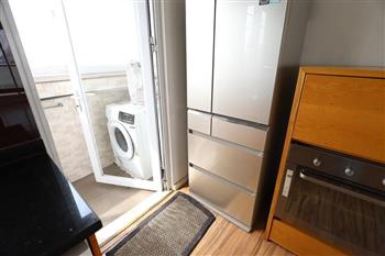 The space is designed with an open concept, maximizing natural light. The spacious living and dining areas feature beautiful polished wood flooring, modern sofas, an artistic crystal chandelier, and large floor-to-ceiling windows that provide natural light and romantic views. The balcony with its tempered glass railing opens up to a refreshing outdoor space.