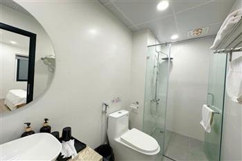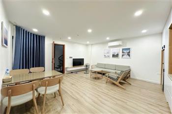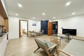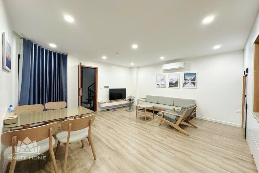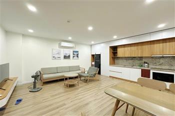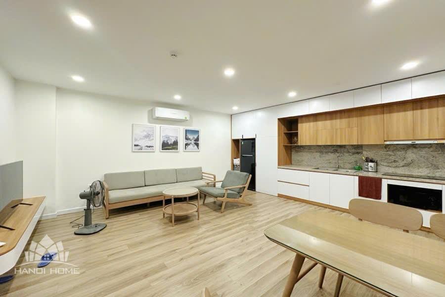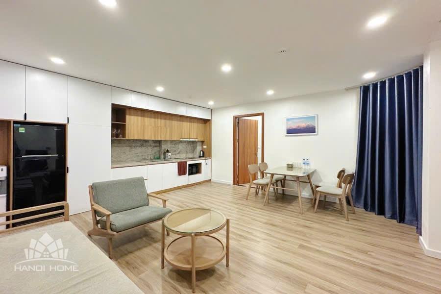This one-bedroom apartment is a luxurious and modern choice in Quang Khanh, Tay Ho area, offering a minimalist yet high-end living space. The entire common area is designed in an open-plan style, featuring light wood flooring. The interior decor primarily uses light wood and white tones, creating an elegant and spacious atmosphere. The living room is highlighted by a minimalist wooden-framed sofa set and armchair, positioned opposite the entertainment area with a wall-mounted TV, all warmly illuminated by modern ceiling lighting.