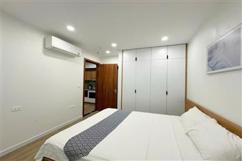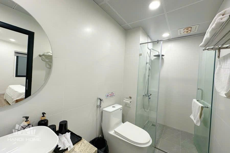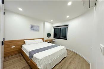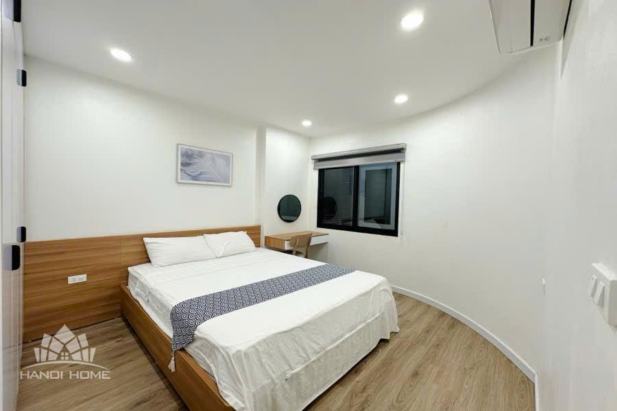 The kitchen area is equipped with modern, ceiling-height cabinetry, combining white and natural wood sections to maximize both storage and aesthetics. The separate bedroom features a double bed and a large wardrobe, ensuring tidiness and privacy. This apartment is the perfect blend of refined design, complete furnishings, and a prime location, making it an ideal place to enjoy a quality lifestyle in Tay Ho.
