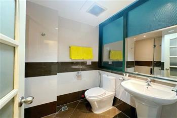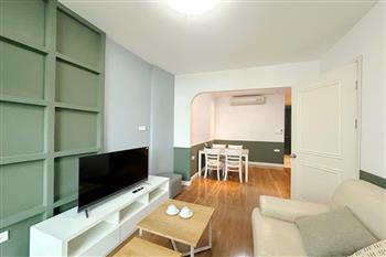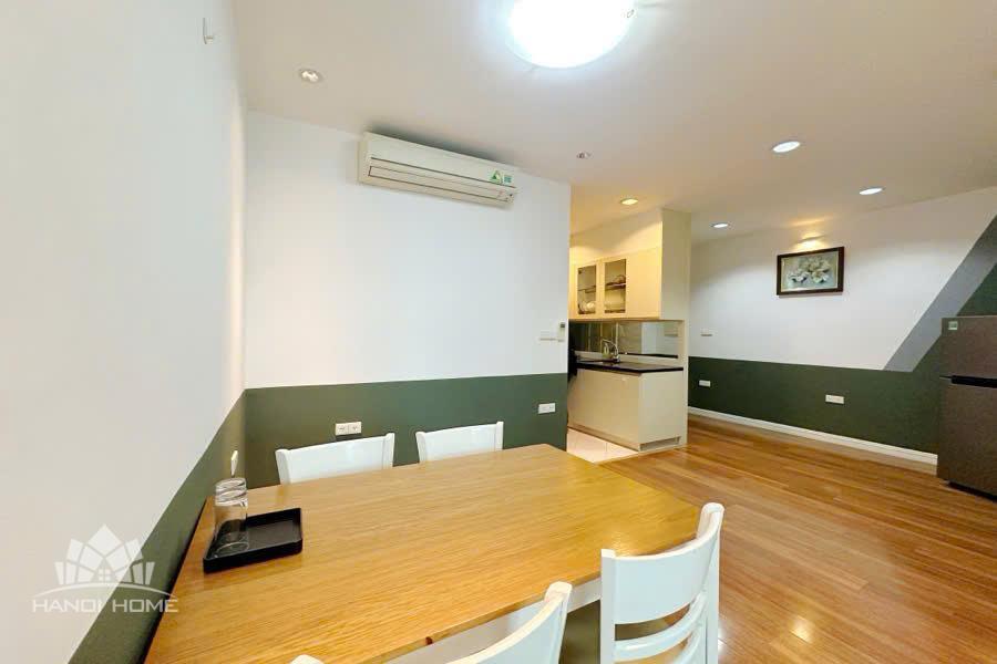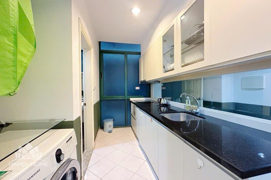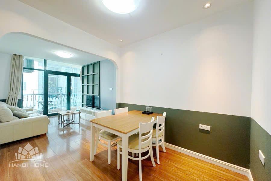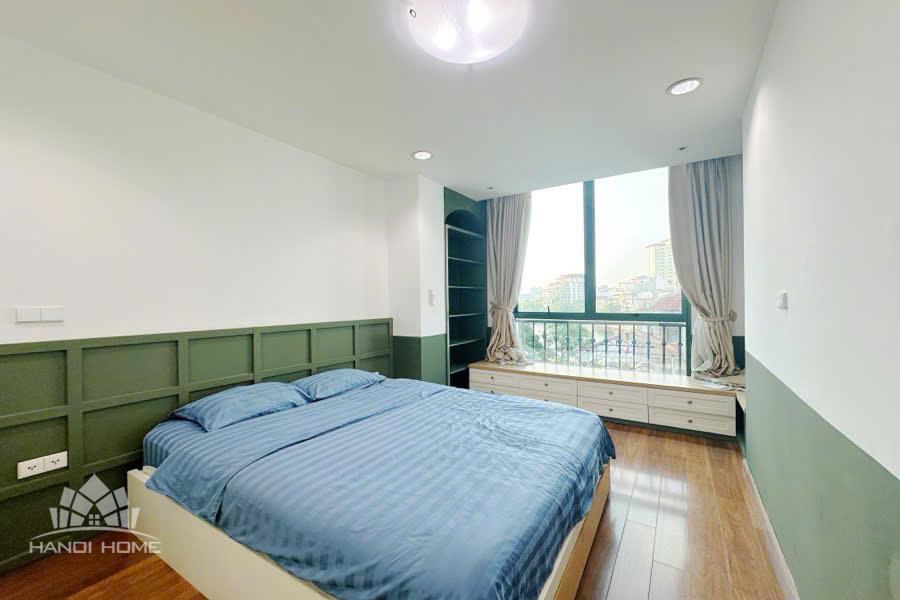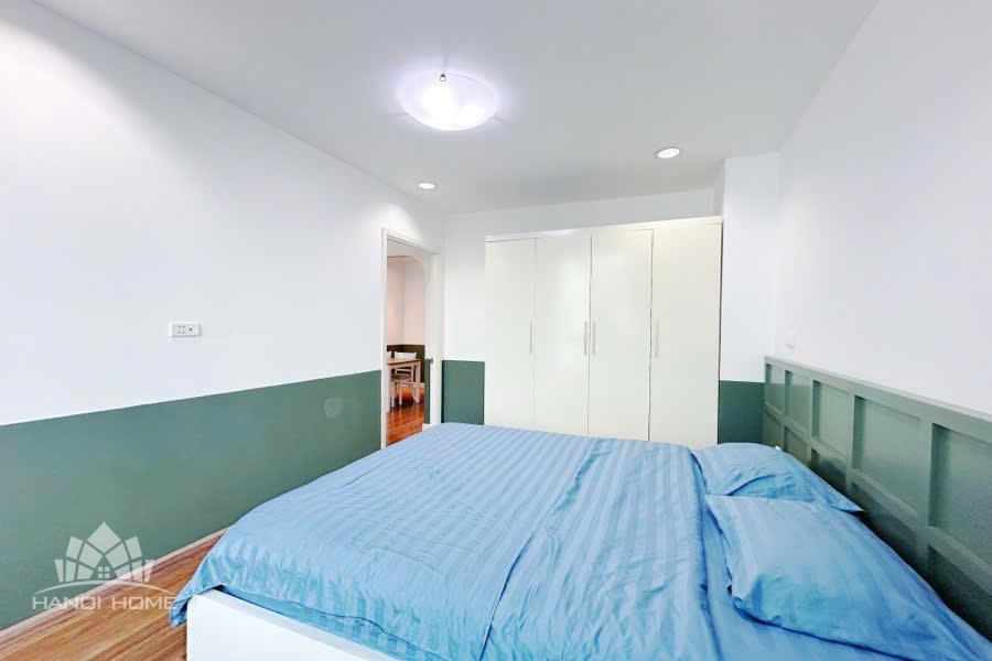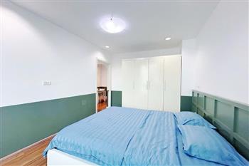 This apartment is located in the Ba Dinh area, featuring a modern and youthful design. The space uses white, moss green, and light blue as its main colours, creating a clean and relaxing atmosphere. High-quality wooden flooring is used throughout the unit.