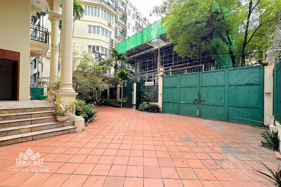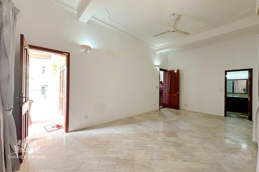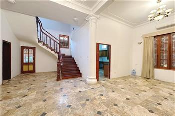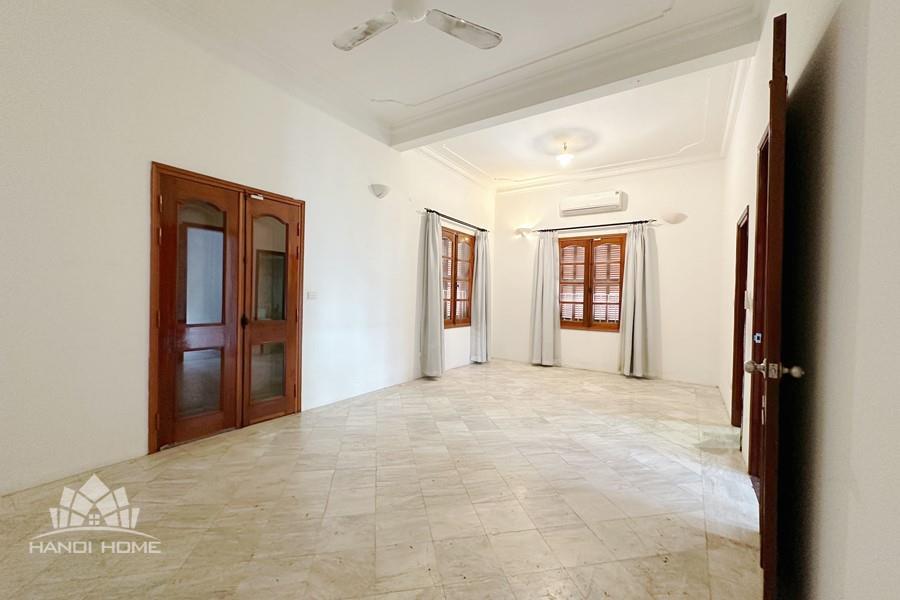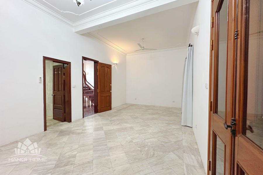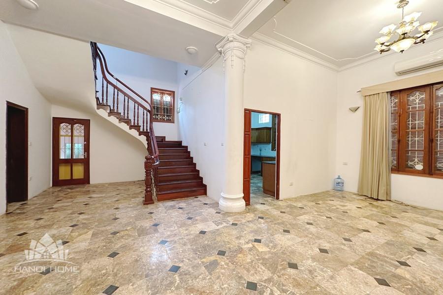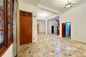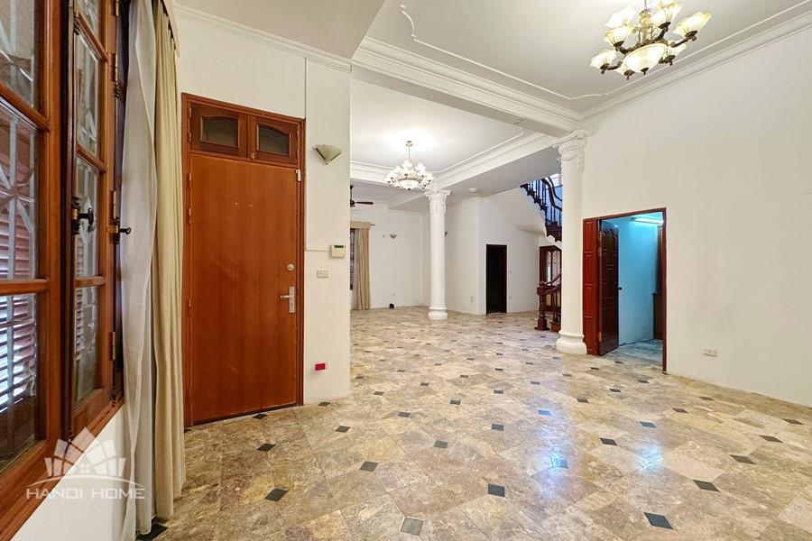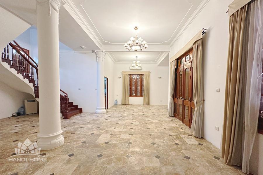 The interior space is equally impressive, with a massive living area floored in high-end marble, uniquely accented with contrasting black square inlays. The high ceilings are adorned with elaborate crown molding and impressive crystal chandeliers, enhancing the opulent feel. The architectural theme continues inside with carved internal columns and warm, reddish-brown natural wood used for all doors and the sweeping staircase. Given its substantial scale, the house can easily accommodate up to 5 bedrooms or more, making it an ideal choice for high-end living in Hanoi’s most desirable Tay Ho district.