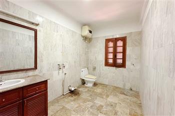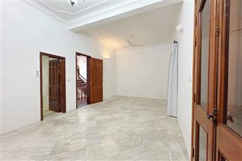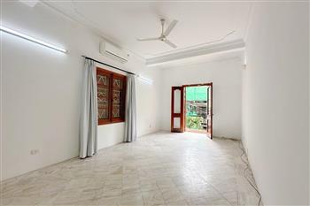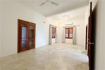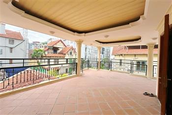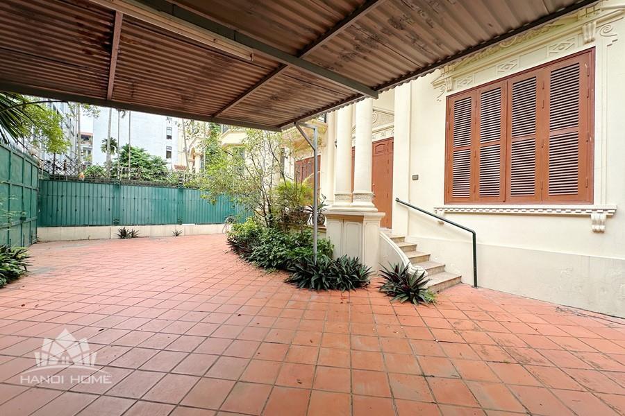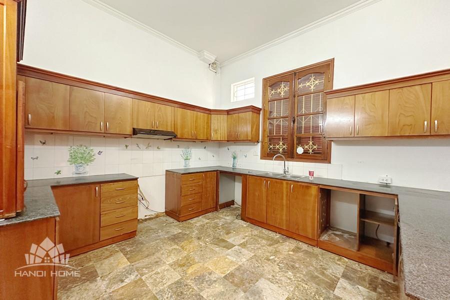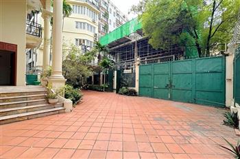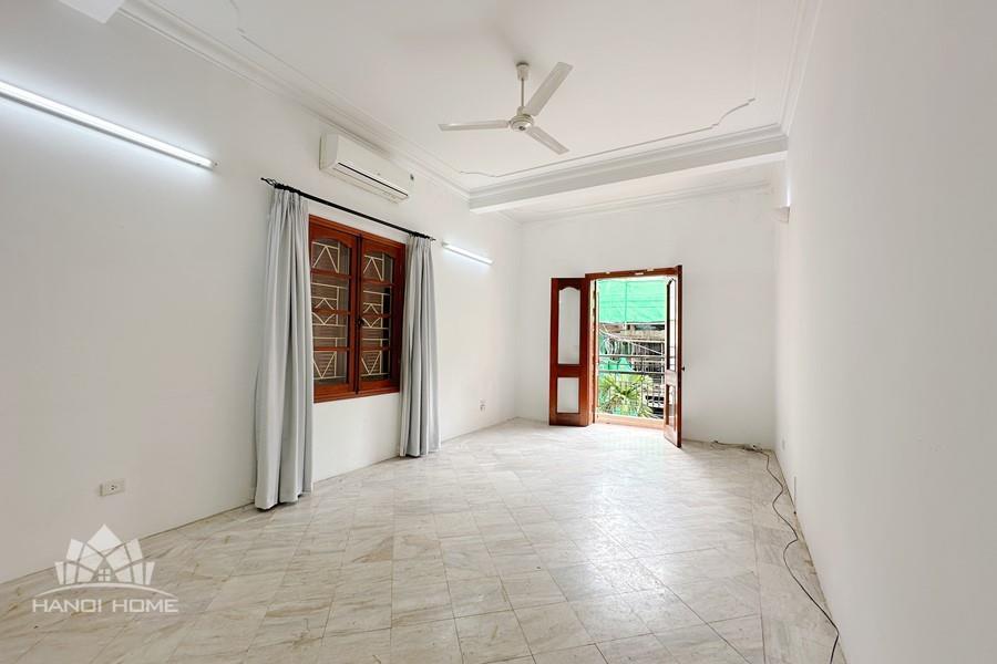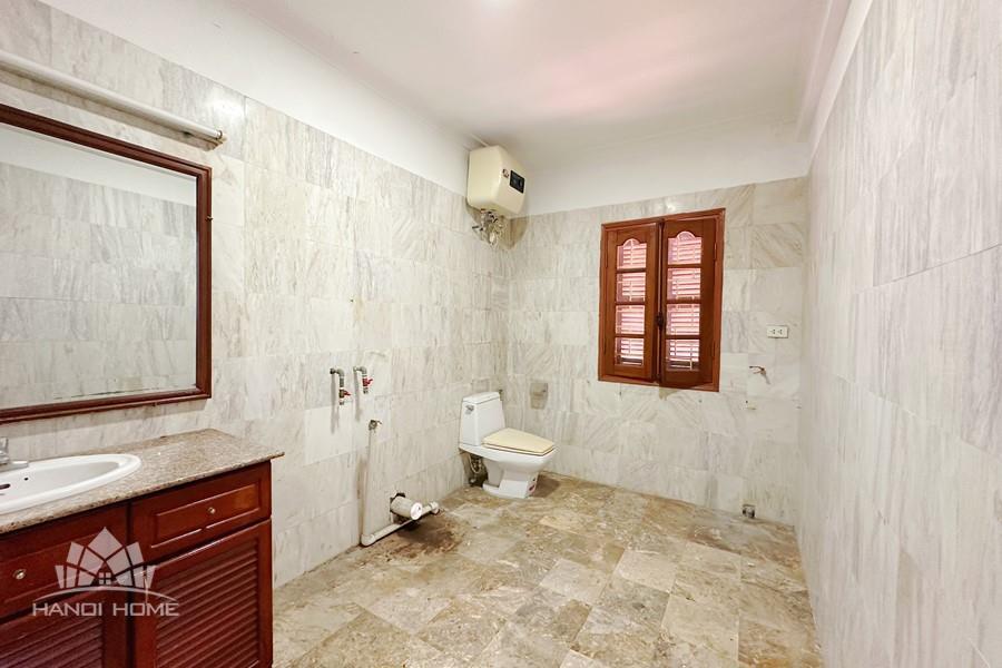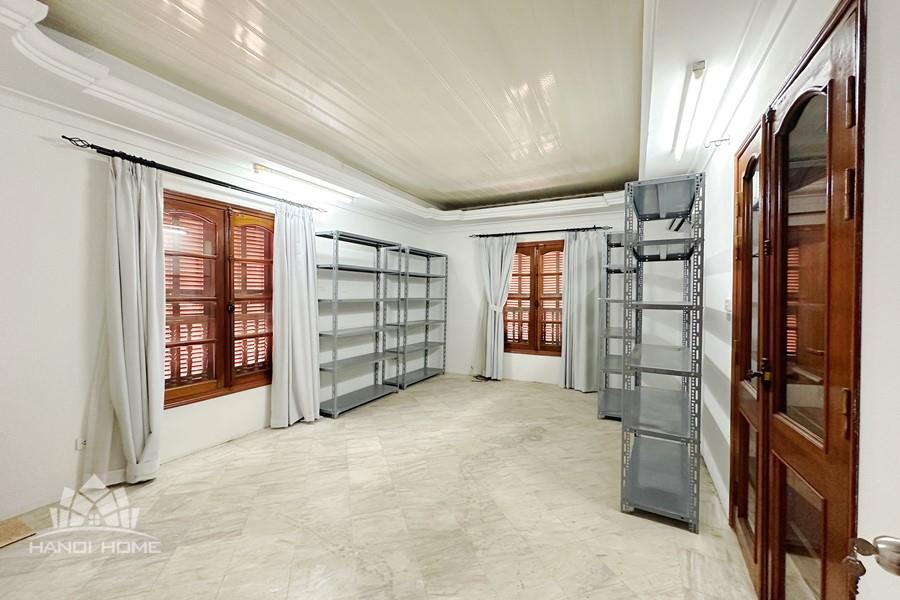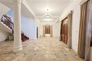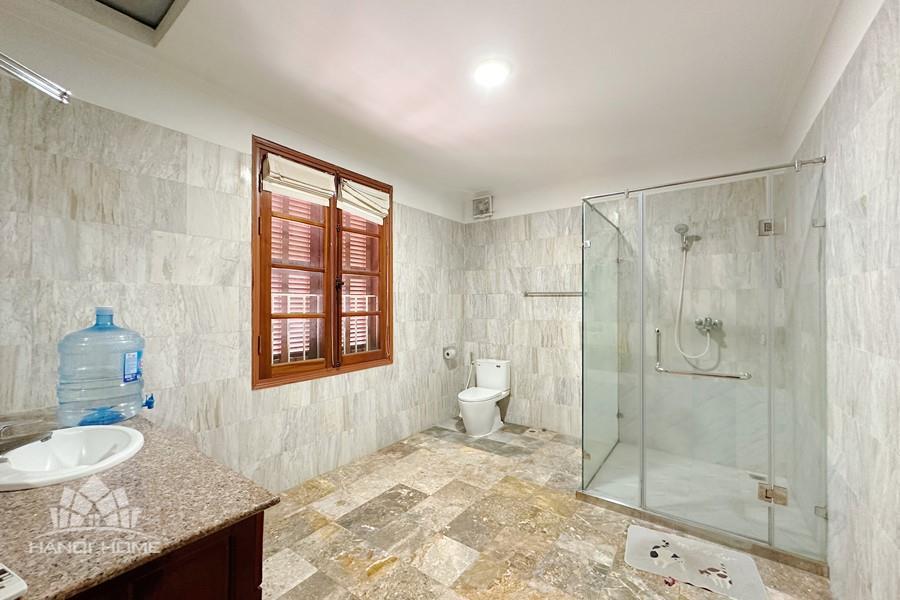 The interior space is equally impressive, with a massive living area floored in high-end marble, uniquely accented with contrasting black square inlays. The high ceilings are adorned with elaborate crown molding and impressive crystal chandeliers, enhancing the opulent feel. The architectural theme continues inside with carved internal columns and warm, reddish-brown natural wood used for all doors and the sweeping staircase. Given its substantial scale, the house can easily accommodate up to 5 bedrooms or more, making it an ideal choice for high-end living in Hanoi’s most desirable Tay Ho district.