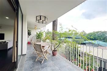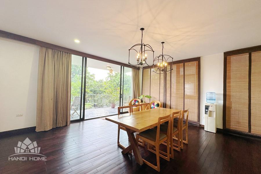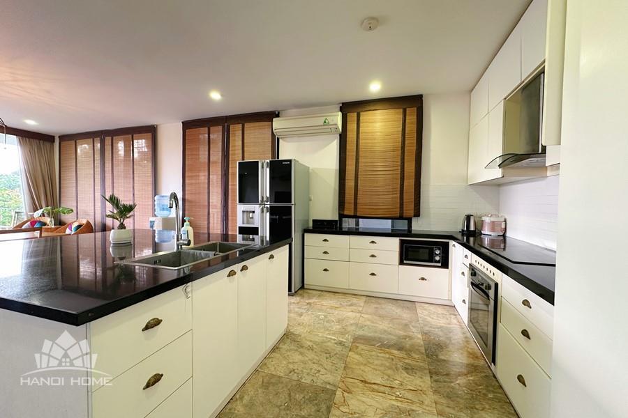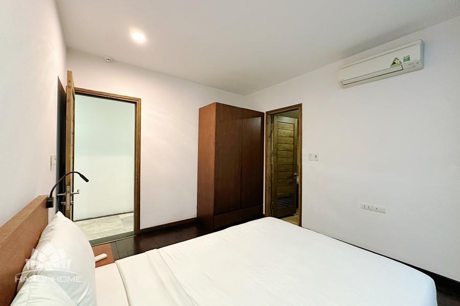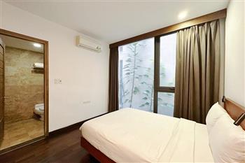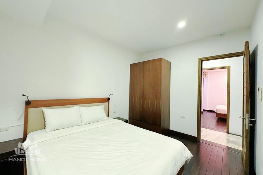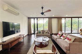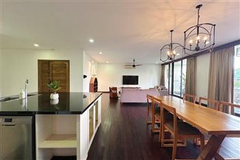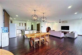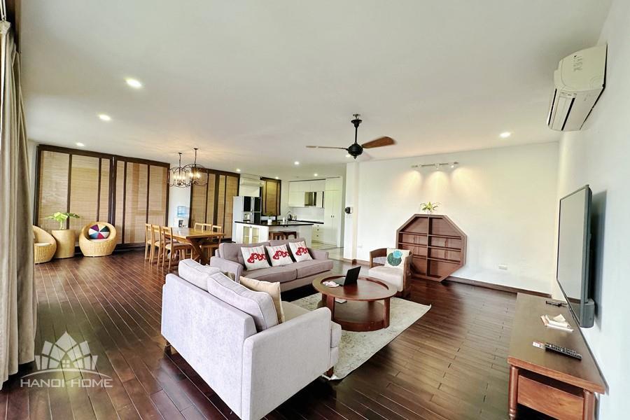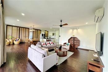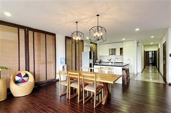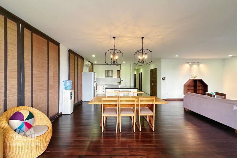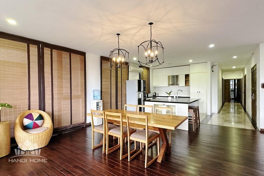 Three-bedroom Japanese-style apartment in Xóm Chùa, Tây Hồ. Located in a quiet residential area just steps from West Lake, this spacious apartment combines minimalist Japanese aesthetics with modern elegance. The interior features clean lines, natural materials, and a neutral color palette that creates a harmonious and calming atmosphere. Large glass windows throughout the apartment allow abundant natural light to flood the space and offer scenic views of surrounding greenery.