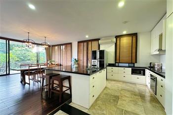 The kitchen is fully equipped with sleek white cabinetry, high-end appliances, a central island, and a spacious dining area perfect for family gatherings. All three bedrooms are bright and well-organized, featuring large windows, comfortable beds, built-in wardrobes, and a tranquil ambiance.