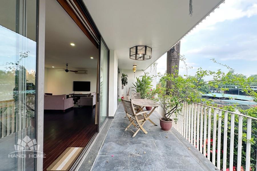 The wide balcony is tiled with stone, furnished with wooden chairs and tables, and decorated with potted plants, making it an ideal spot for relaxing or enjoying tea while overlooking the lake. The living room is open and inviting, with light-colored sofas, a wooden coffee table, a minimalist TV console, and a Japanese-style ceiling fan.