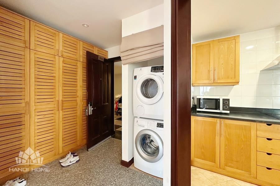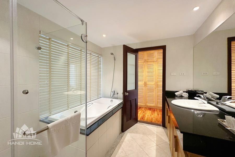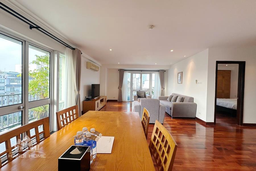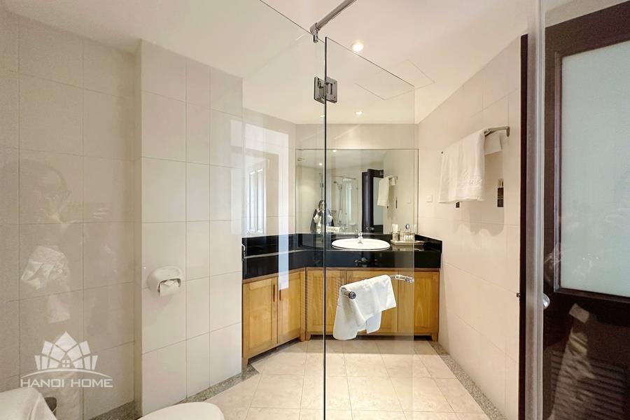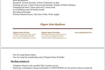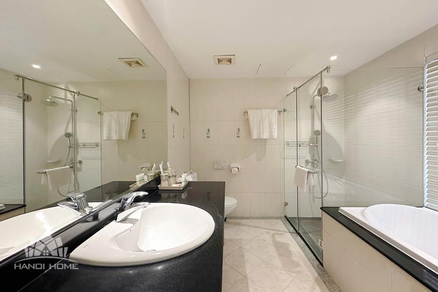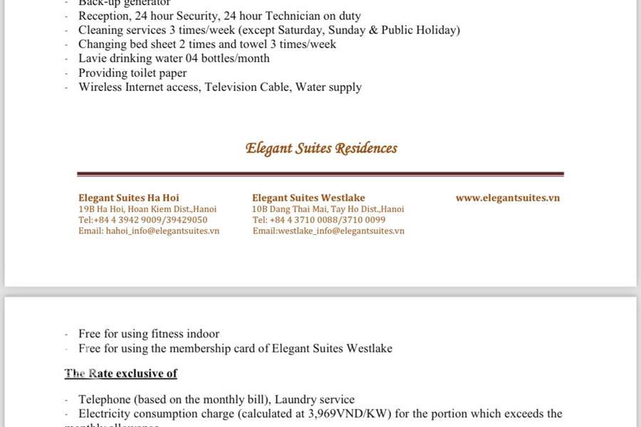 Elegant Suites Hanoi – Spacious 2-Bedroom Serviced Apartment for Rent in Hoan Kiem This elegant 2-bedroom serviced apartment offers a spacious and comfortable living space in the heart of Hoan Kiem. The apartment is fully furnished with modern, high-quality furniture and a fully equipped kitchen, ideal for convenient daily living. The rental rate includes 10% VAT, an electricity allowance of USD 50/month, management fees, elevator and in-apartment maintenance, and access to a back-up generator. Residents enjoy cleaning services 3 times per week, bed linen changes twice per week, and towel changes three times per week, along with Lavie drinking water (4 bottles/month) and toilet paper. Additional amenities include 24/7 reception, security, on-duty technicians, high-speed Wi-Fi, and cable TV, all within a prime central location close to Hoan Kiem Lake and the Old Quarter.