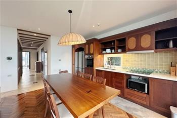 Premium furnishings: Fully equipped with elegant touches including a plush fabric sectional sofa, solid wood dining table, artistic pendant lighting, and a sleek modern kitchen. Neutral tones paired with wood accents create a warm and sophisticated atmosphere.