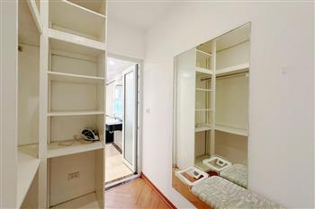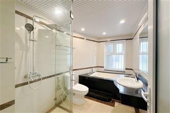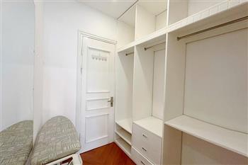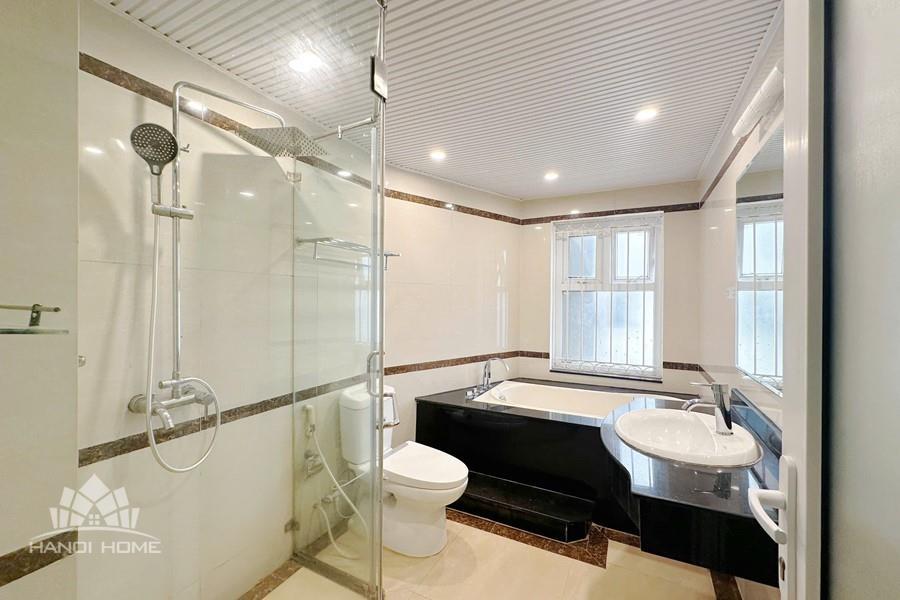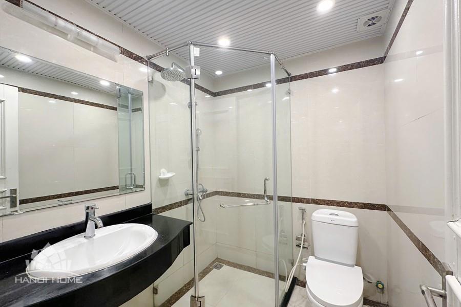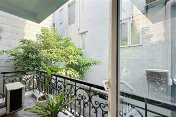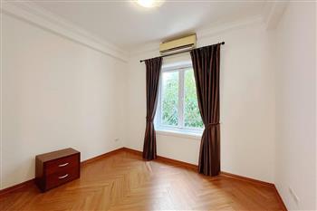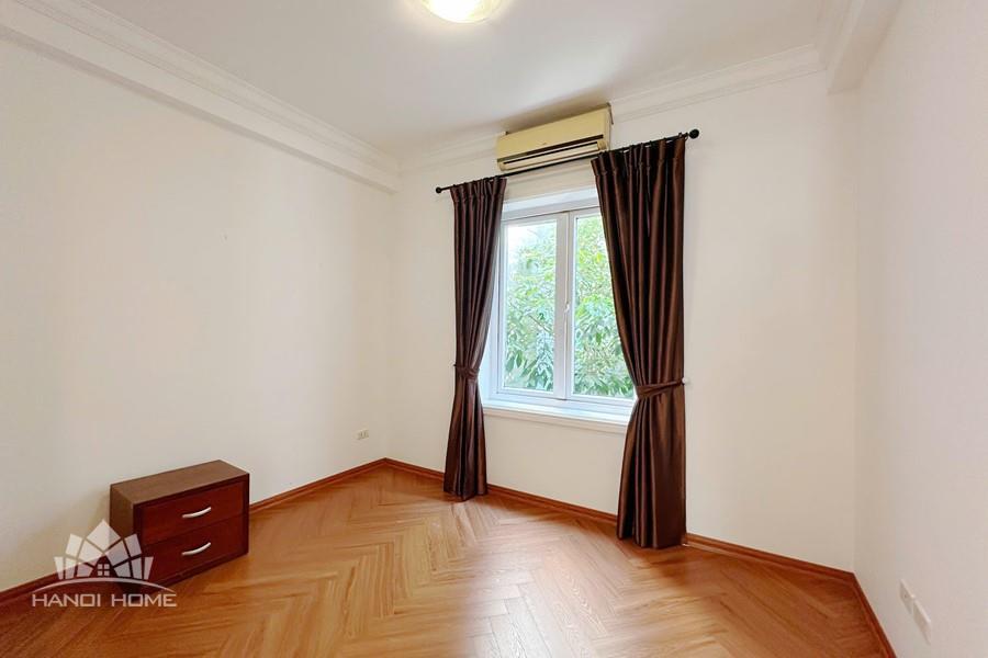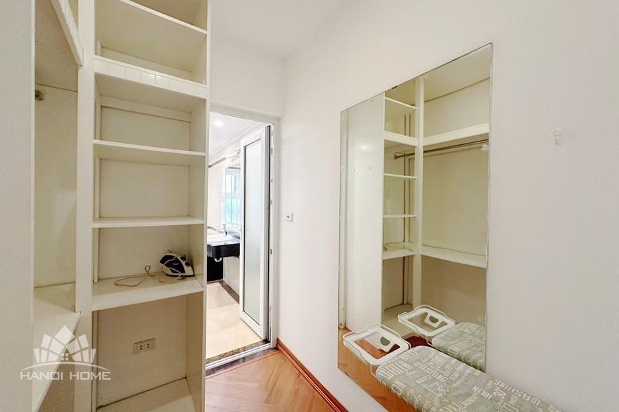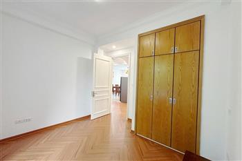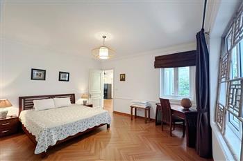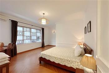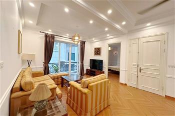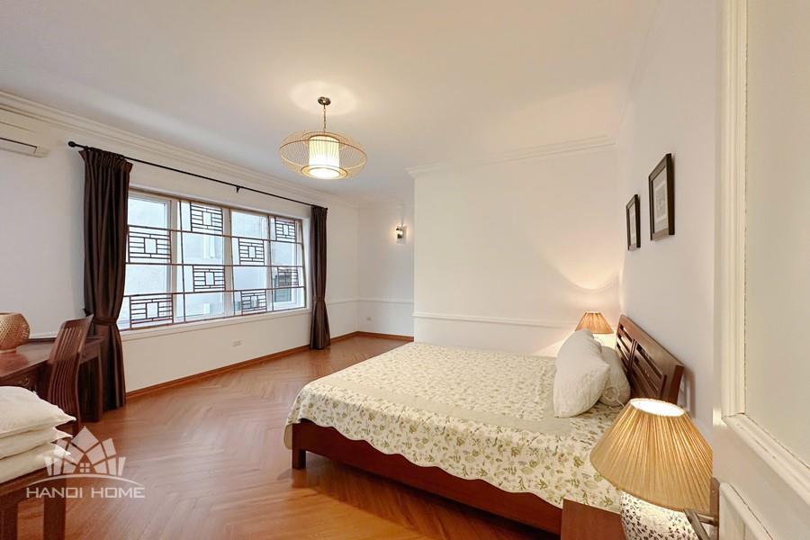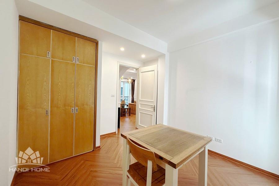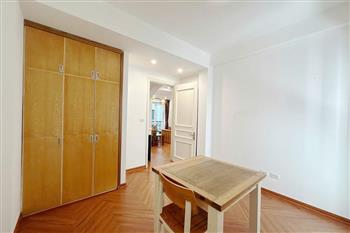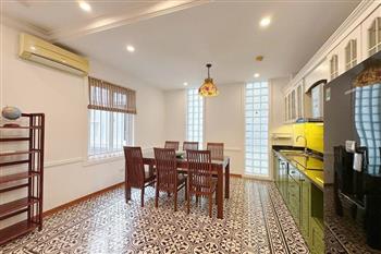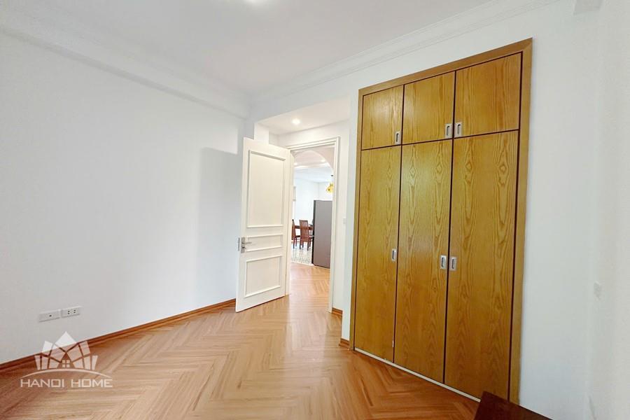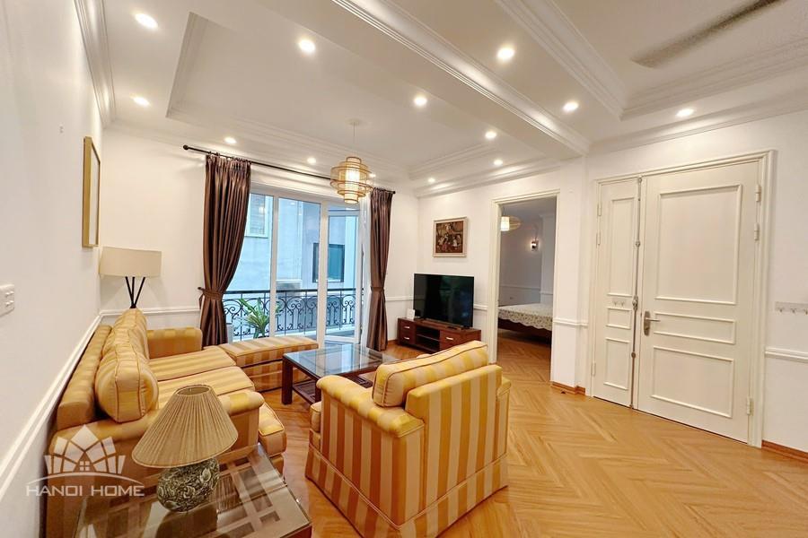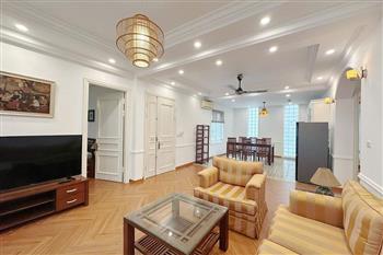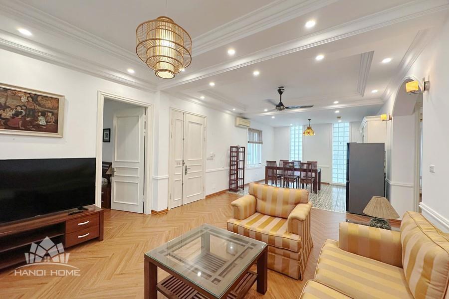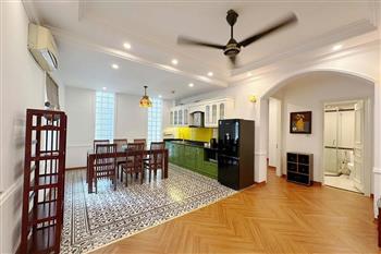This 3-bedroom apartment in Vu Mien, Tay Ho, features a luxurious style and a spacious open-plan design. The transition between the living area, which features warm herringbone wooden flooring, and the kitchen, which is tiled with classic patterned tiles, creates a subtle yet elegant separation.