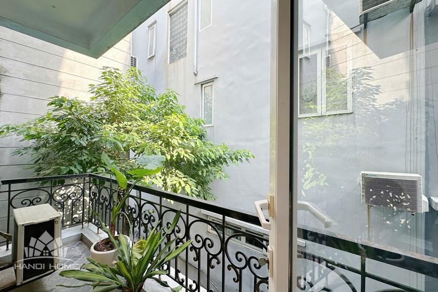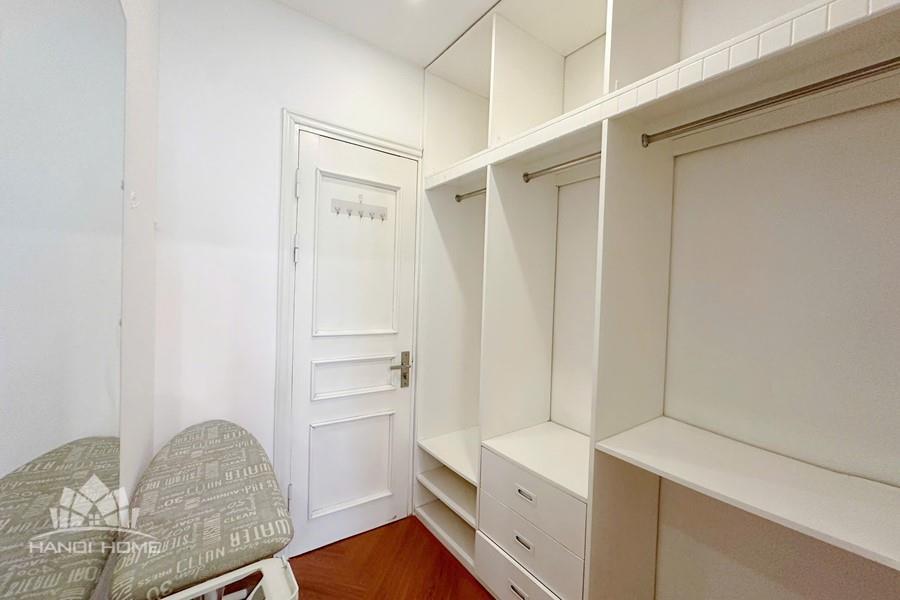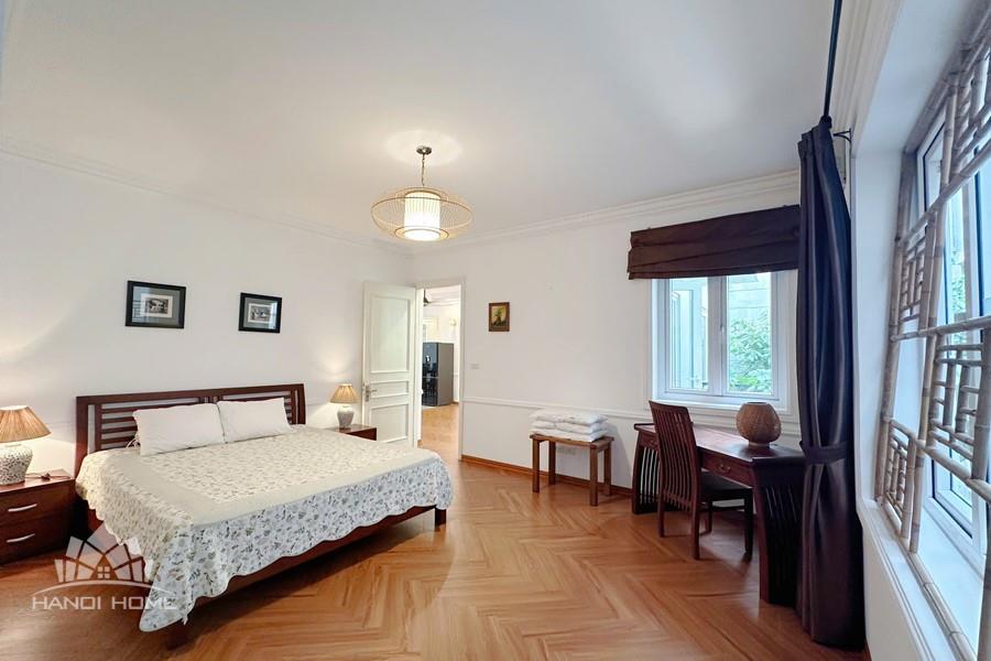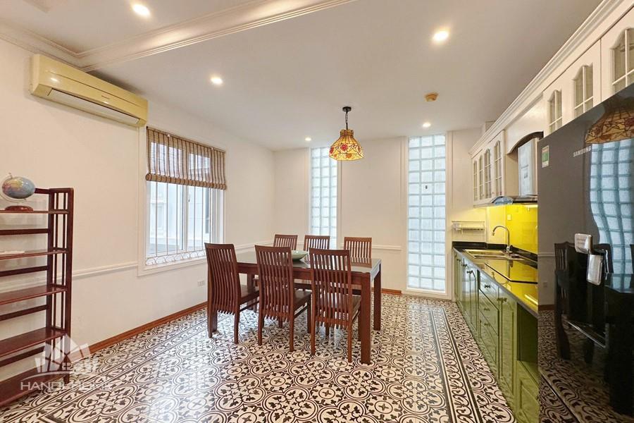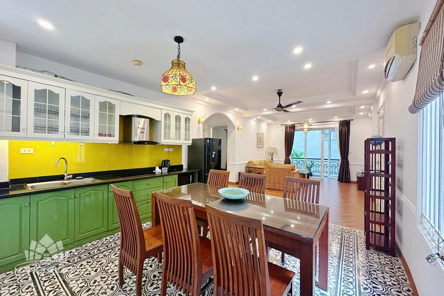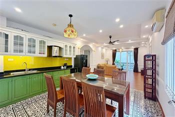 The kitchen is a striking focal point, contrasting classic dark green cabinetry with a modern lime-yellow tiled backsplash. The wooden furnishings and elegant architectural details underscore the apartment's refined and comfortable appeal, making it ideal for high-end living in Tay Ho.