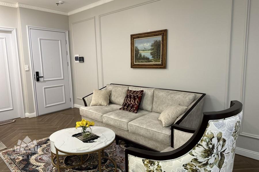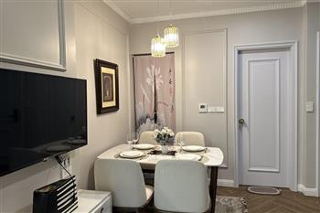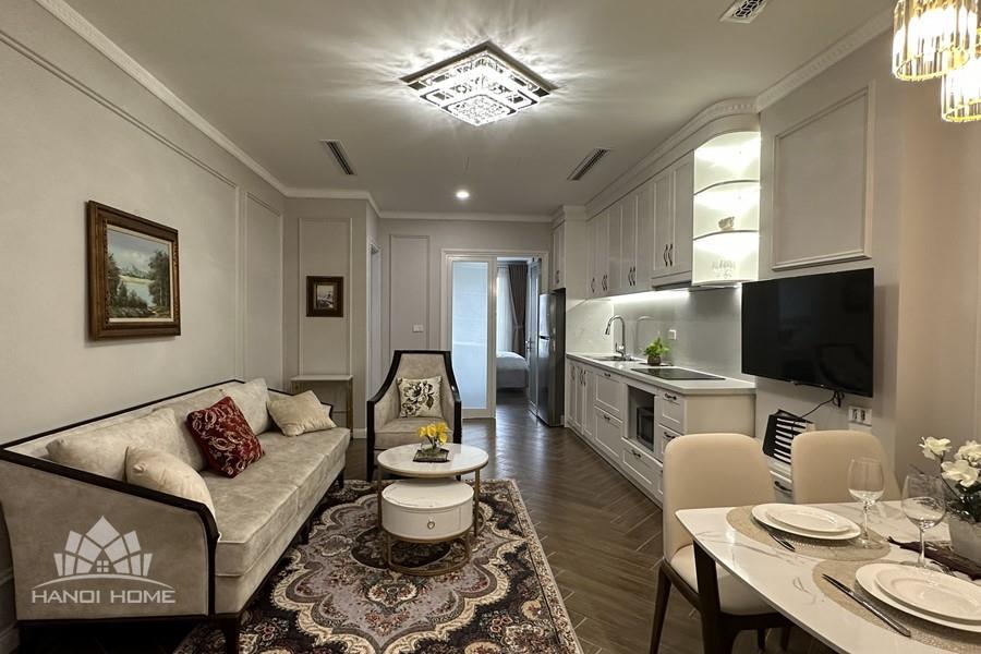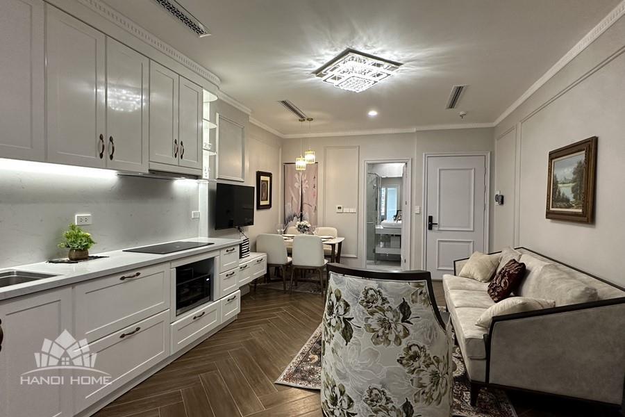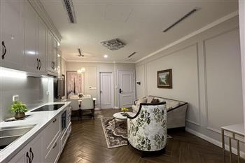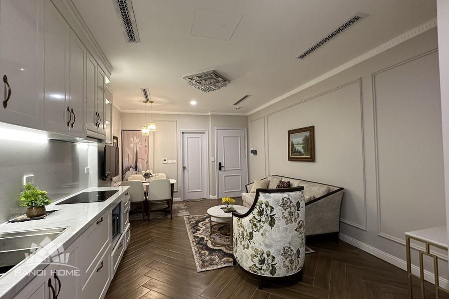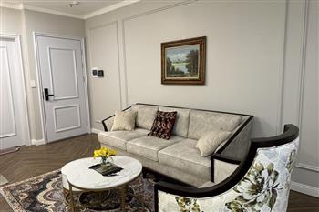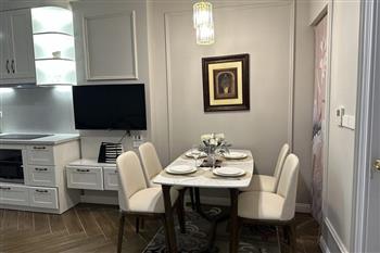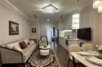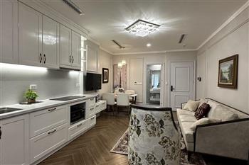 The interior design is meticulously crafted, from the living room to the bedrooms and kitchen. The living area features a high-end upholstered sofa, a sleek coffee table, an artistic chandelier, and decorative touches inspired by classic European aesthetics. The kitchen and dining area are fully equipped with modern conveniences: wooden cabinetry, a polished stone countertop, built-in appliances such as an oven, range hood, and refrigerator, and a natural wood dining table paired with cushioned chairs for added comfort.