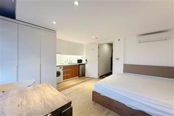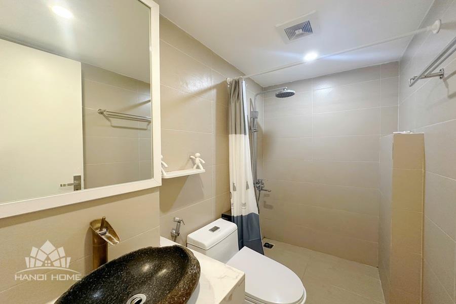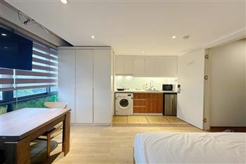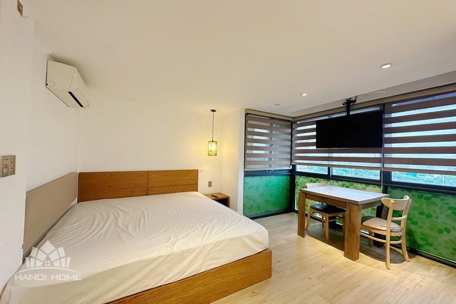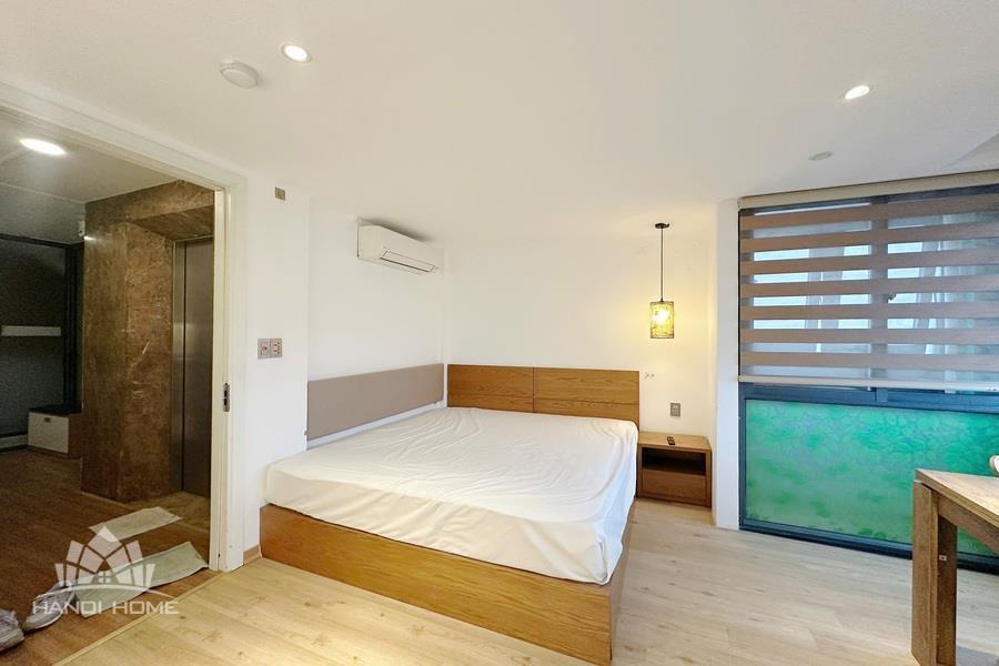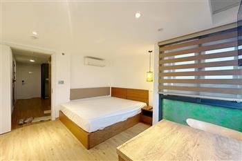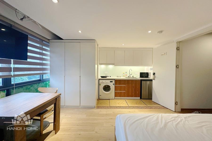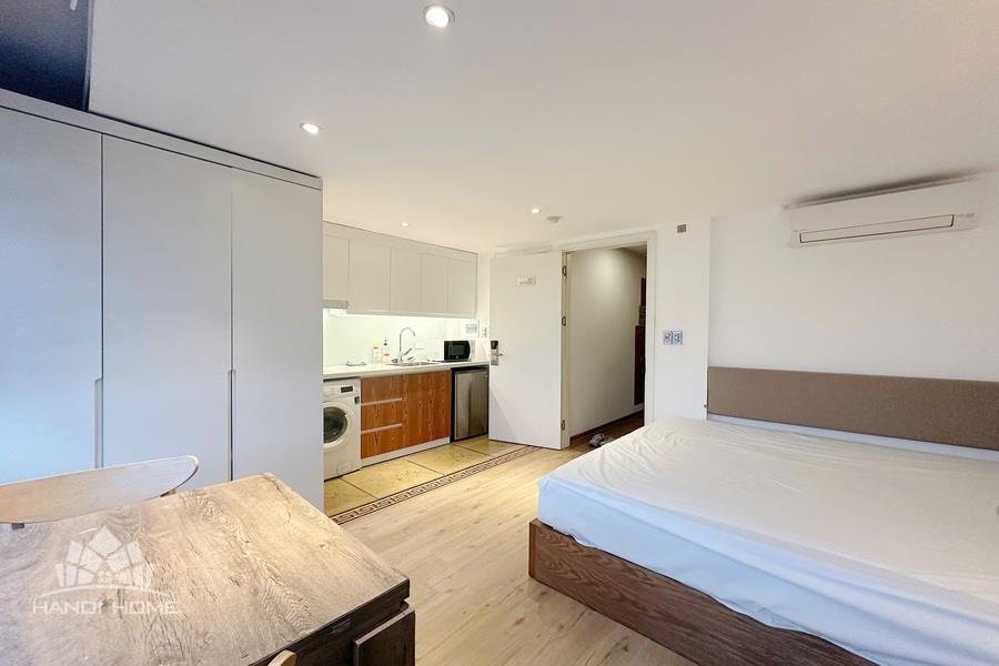 The apartment is located in a quiet area with convenient access on Au Co Street, Tay Ho area, making it ideal for young couples or individuals seeking a modern living space at an affordable price. • Size: 25m² • Furnishing: Fully equipped with furniture and appliances • Minimalist and modern, featuring neutral tones and natural wood materials for a cozy atmosphere