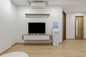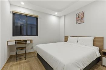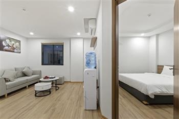 The interior is thoughtfully designed in a contemporary style, featuring light tones and neatly arranged furnishings. The living room includes a cozy sofa, a small coffee table, wall art, and well-placed lighting that creates a warm and relaxing atmosphere. Though compact, the kitchen is fully equipped with a refrigerator, induction cooktop, built-in washing machine, and smart cabinet.The bedroom embraces a minimalist design with a large bed, crisp white linens, a work desk or vanity, and a window that welcomes natural light.