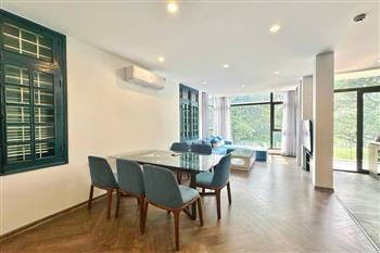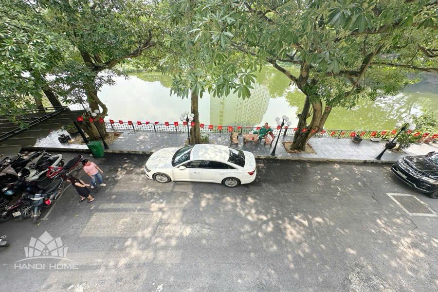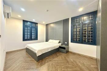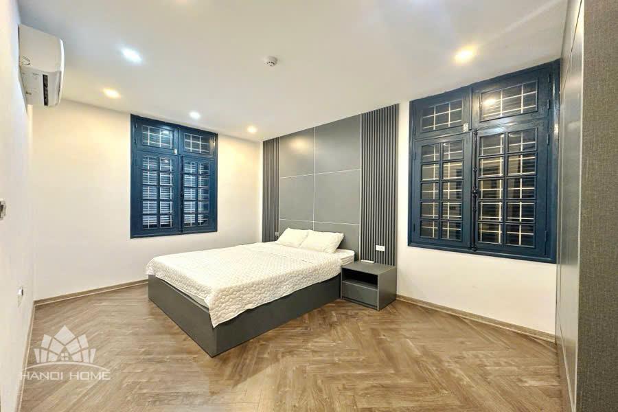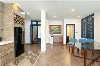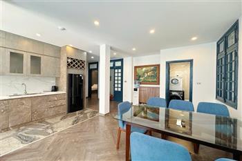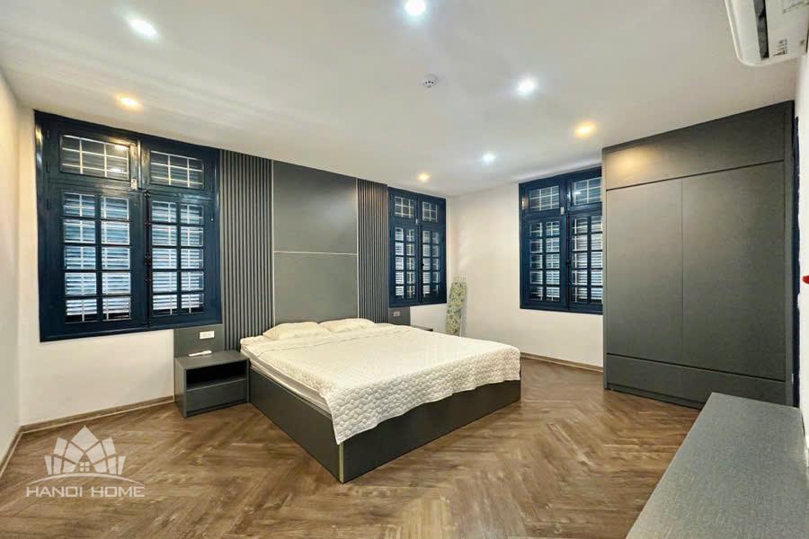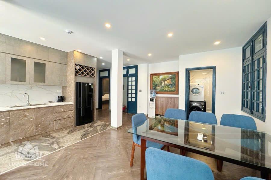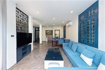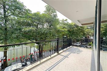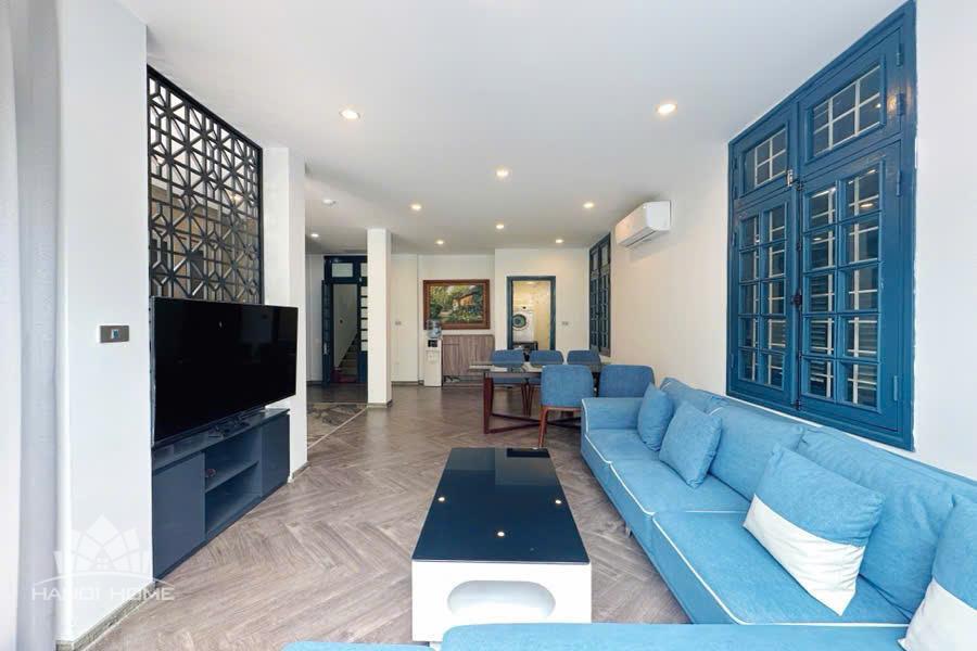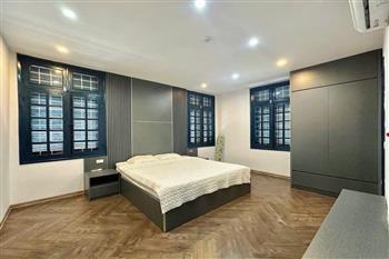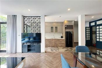This one-bedroom apartment is a perfect choice for a modern and relaxed lifestyle in the Xuan Dieu, Tay Ho area, notable for its direct lake view and abundance of natural light. The unit comes fully furnished with high-end furniture, featuring an elegant combination of white and grey, accentuated by a dominant deep blue tone. The spacious living room, laid with luxurious herringbone wood flooring. These large windows ensure that natural light constantly floods the space, while offering a peaceful vista of lush greenery and calm lake.