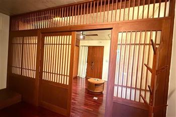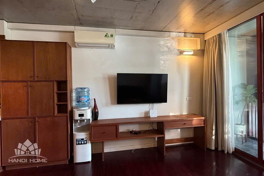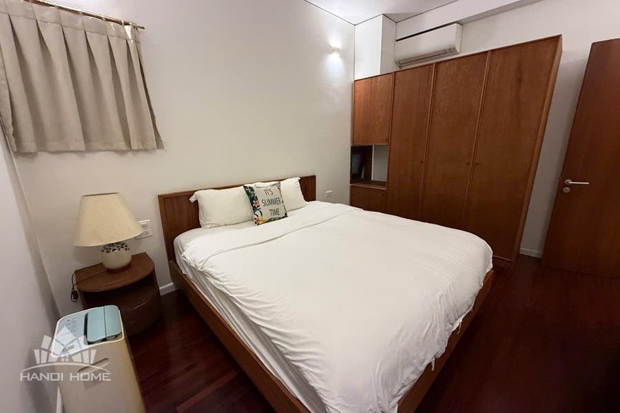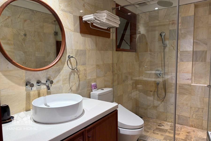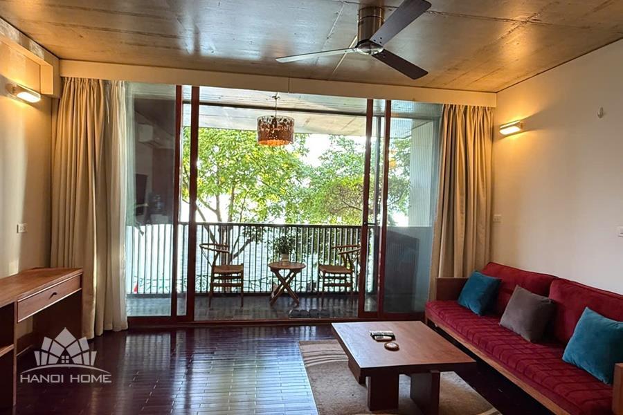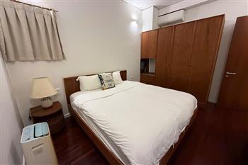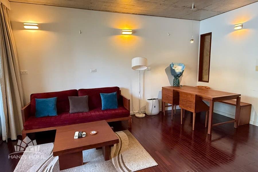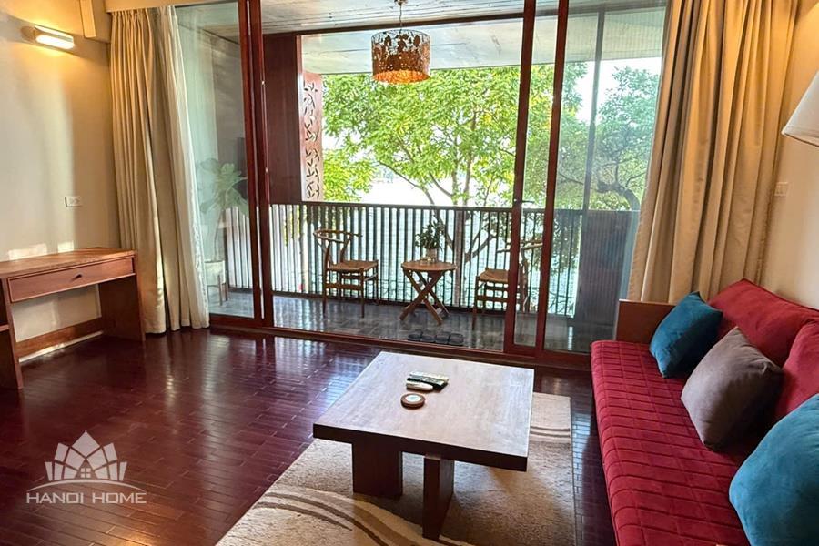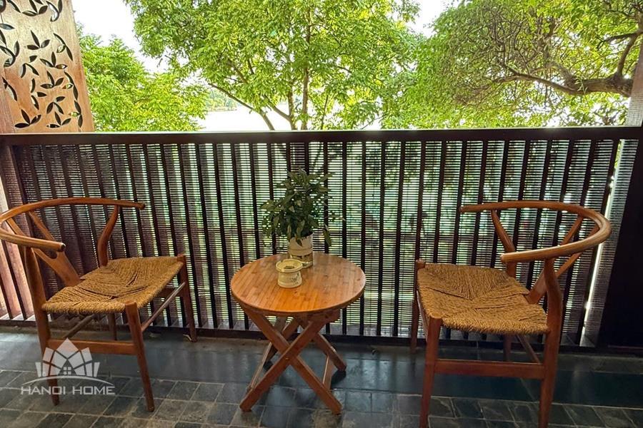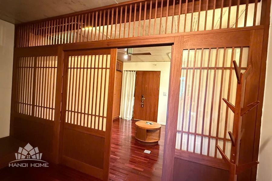 This 2 bedroom apartment with Japanese design, focusing on simplicity, elegance, and a strong connection with nature, offering a stunning view of West Lake. The living room features wood flooring and simple furniture. A low wooden tea table, surrounded by linen cushions, creates a cozy and inviting atmosphere. Floor-to-ceiling glass walls offer a panoramic view of West Lake, allowing natural light to flood the space. Bamboo or sheer white fabric curtains add a touch of lightness and relaxation. This apartment blends traditional Japanese aesthetics with modern amenities, creating a serene living environment with a stunning view of West Lake.