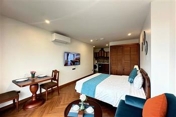 This cozy studio is thoughtfully designed to maximize space and comfort, offering an open layout that combines the living, sleeping, and kitchen areas seamlessly. Large windows and glass doors allow plenty of natural light to fill the apartment, creating a bright and airy atmosphere.