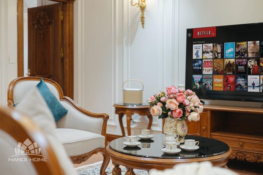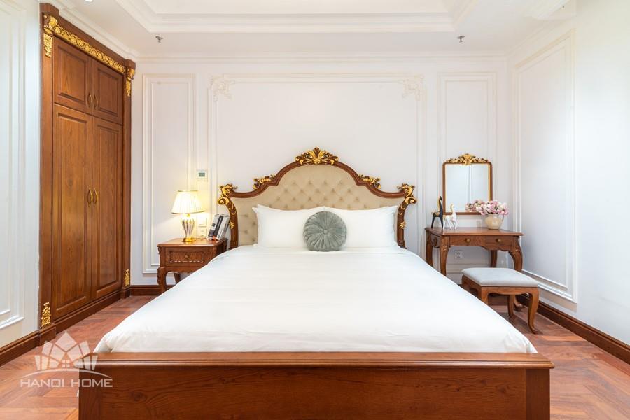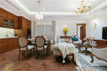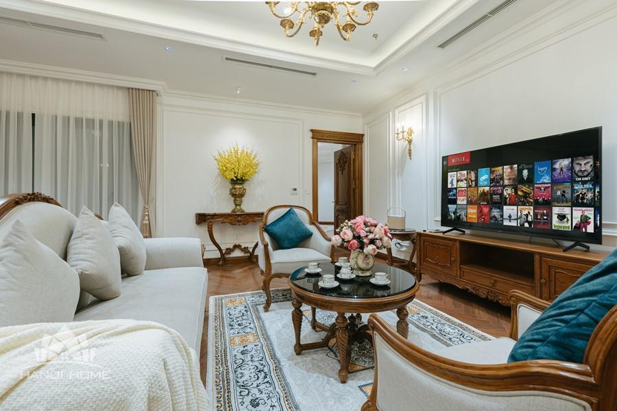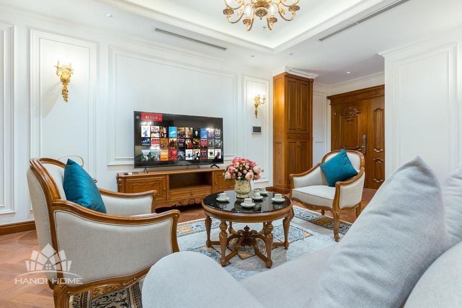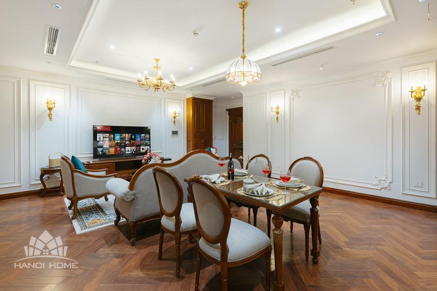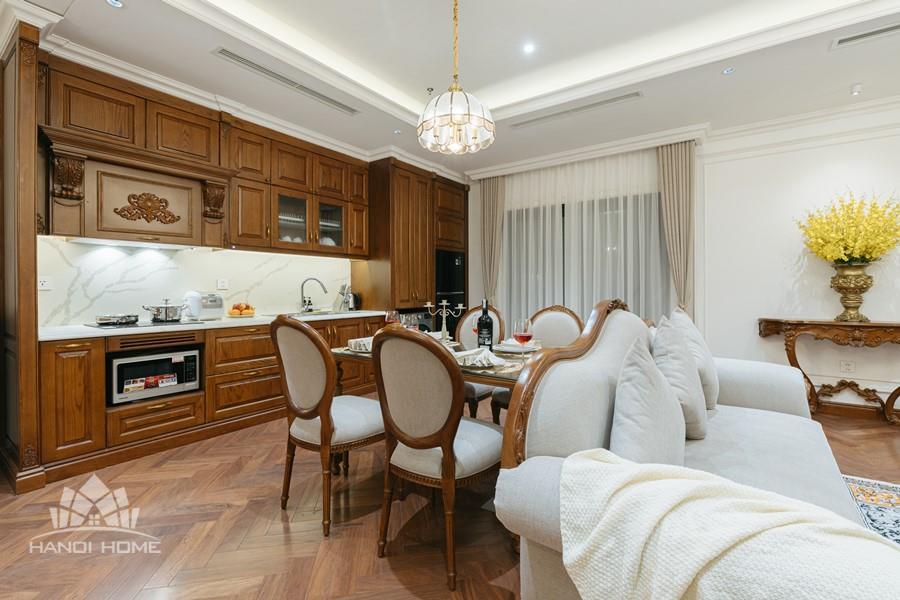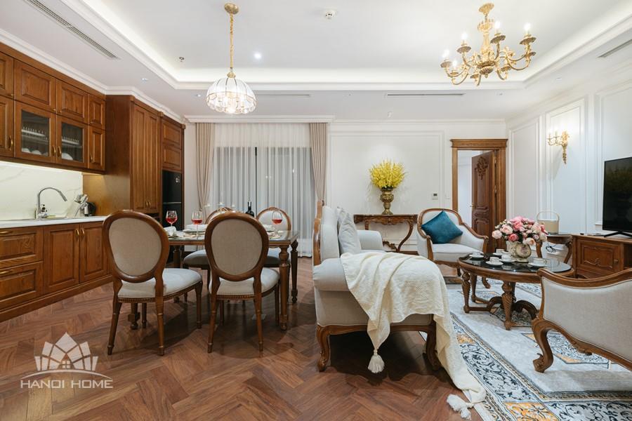This 2-bedroom apartment on Trich Sai, Tay Ho, offers a truly opulent living space, designed in the Neoclassical style. The entire apartment features a sophisticated color palette combining creamy white with dark walnut natural wood, creating a classic and warm contrast.