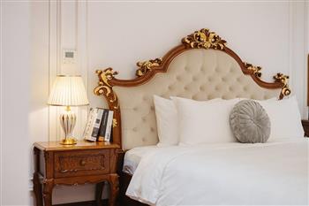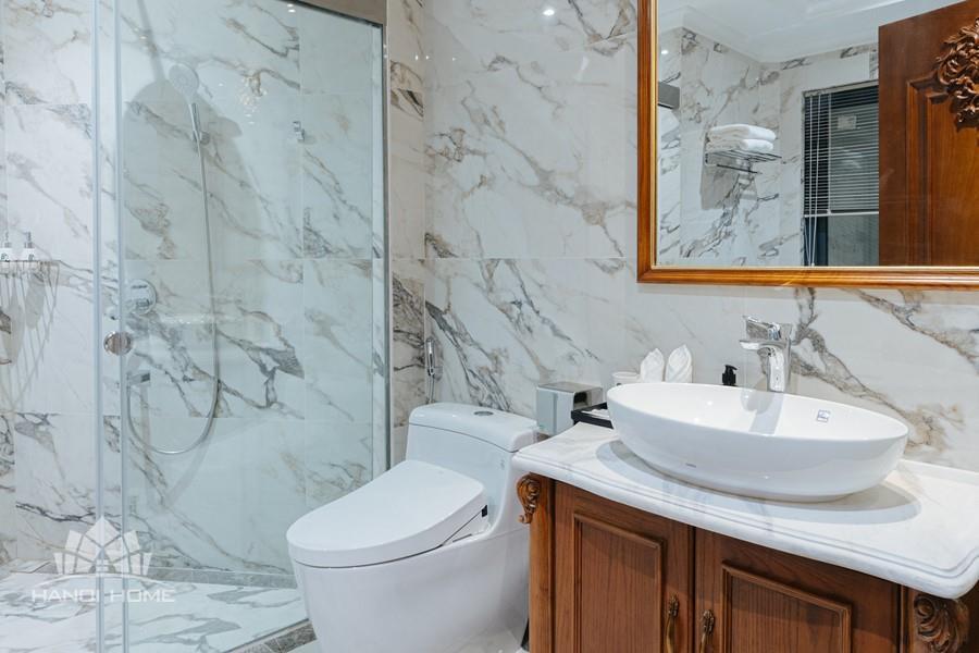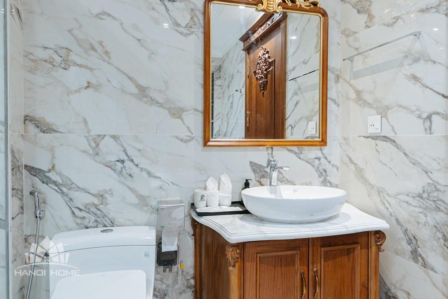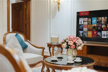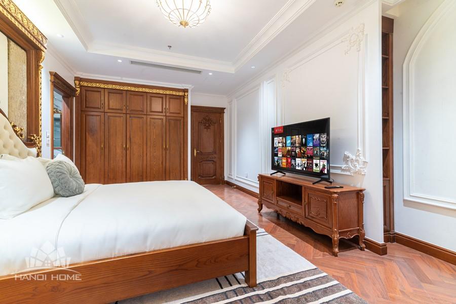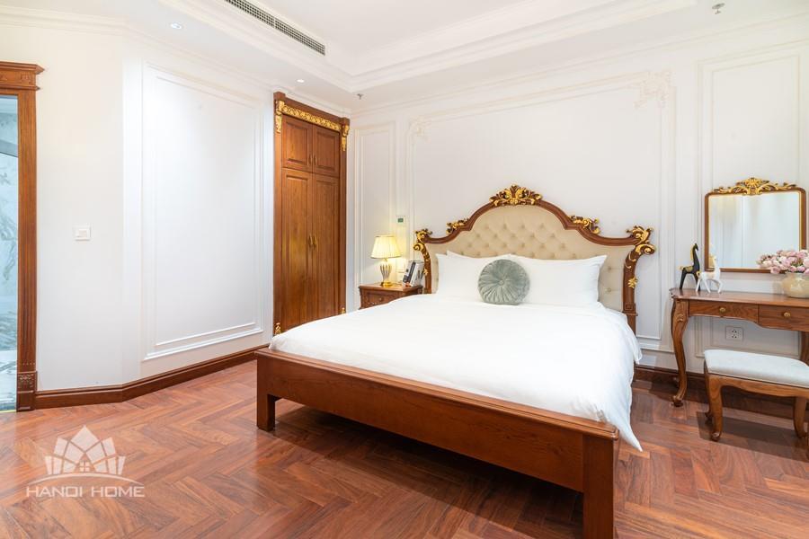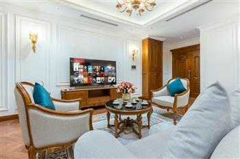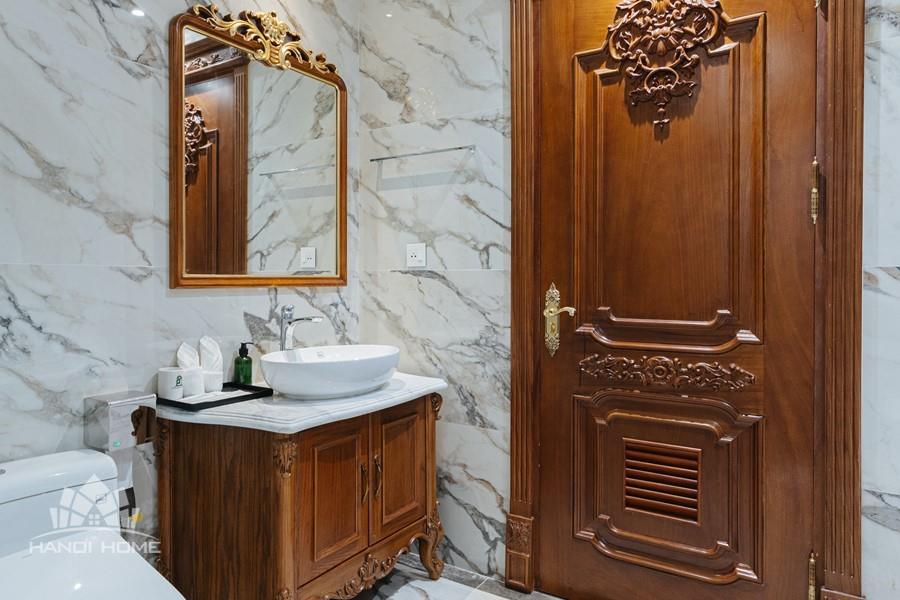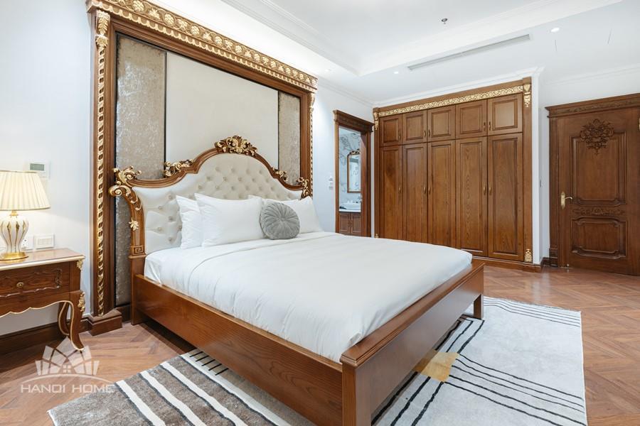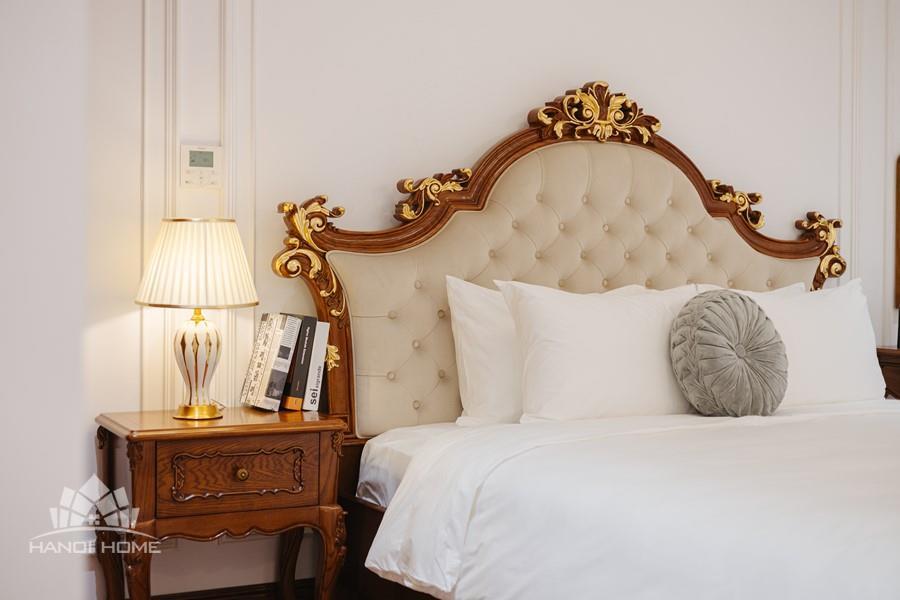 This 2-bedroom apartment on Trich Sai, Tay Ho, offers a truly opulent living space, designed in the Neoclassical style. The entire apartment features a sophisticated color palette combining creamy white with dark walnut natural wood, creating a classic and warm contrast.