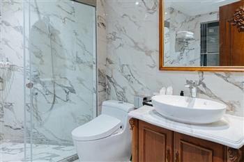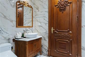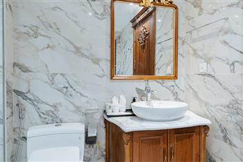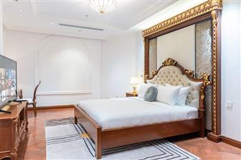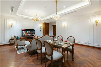 The open-plan kitchen and dining area are highly functional. The kitchen features custom-carved wood cabinetry that matches the interior, paired with stunning white marble-veined countertops. This apartment is a statement of elegant, comfortable, and lavish living in a prime location right by West Lake.