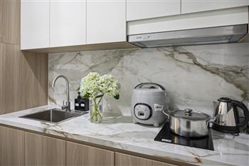 The kitchen is fully equipped and convenient with cream-white and wood-grain cabinets, along with a sophisticated marble veined backsplash and countertop, integrating modern appliances like a large refrigerator, microwave, and washing machine. A highlight not to be missed is the spacious balcony that opens up to a stunning panoramic city view, ideal for relaxation and sightseeing.