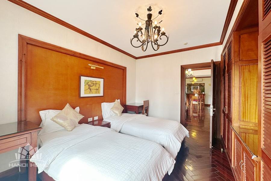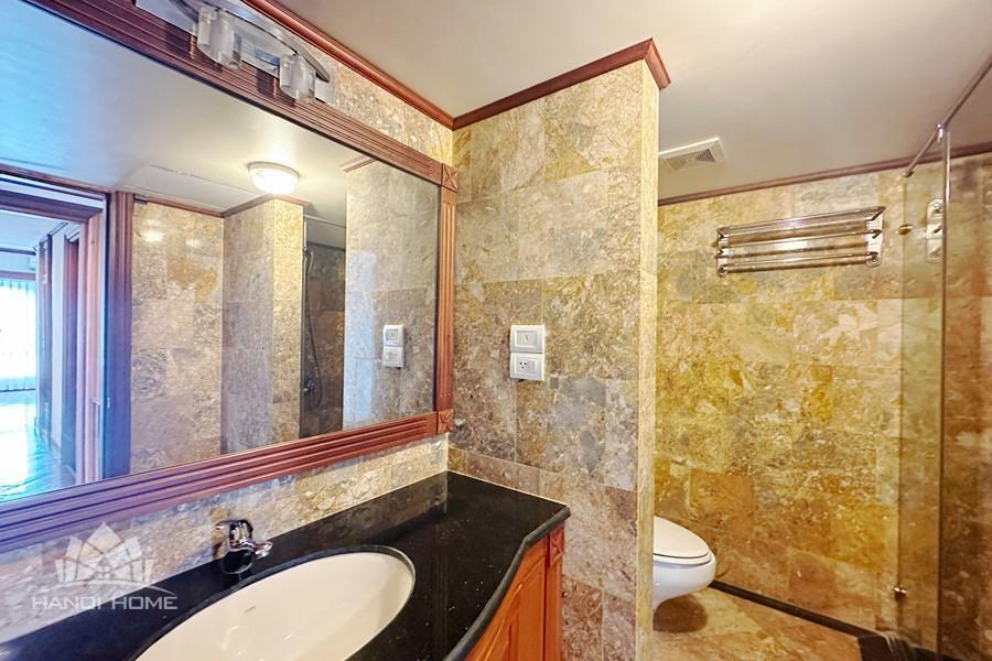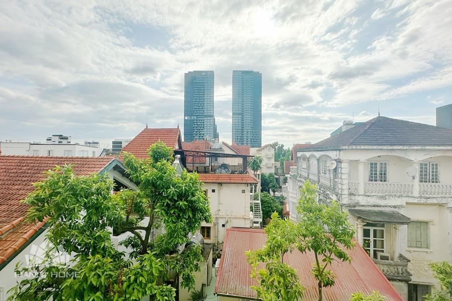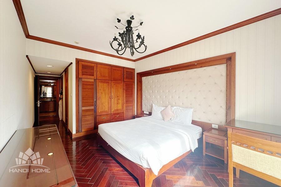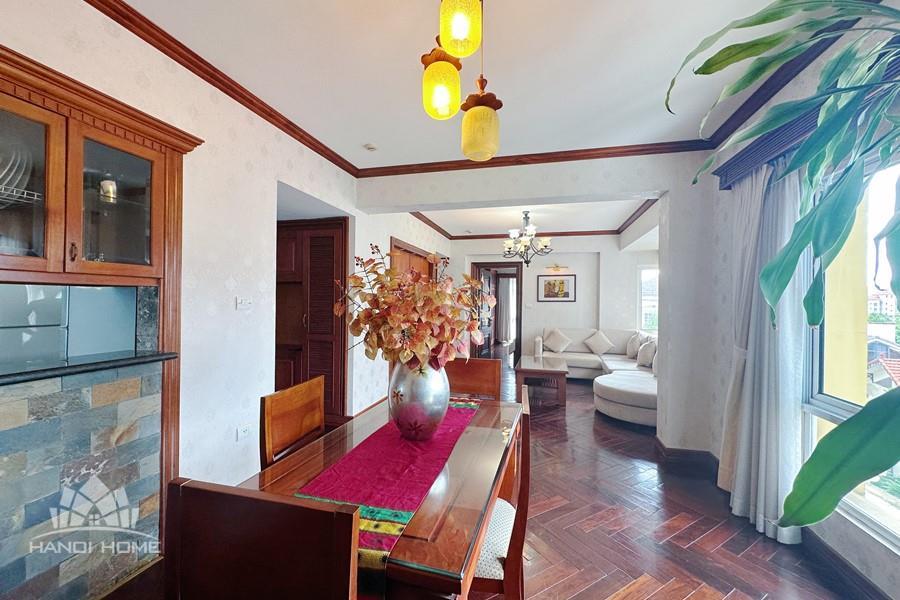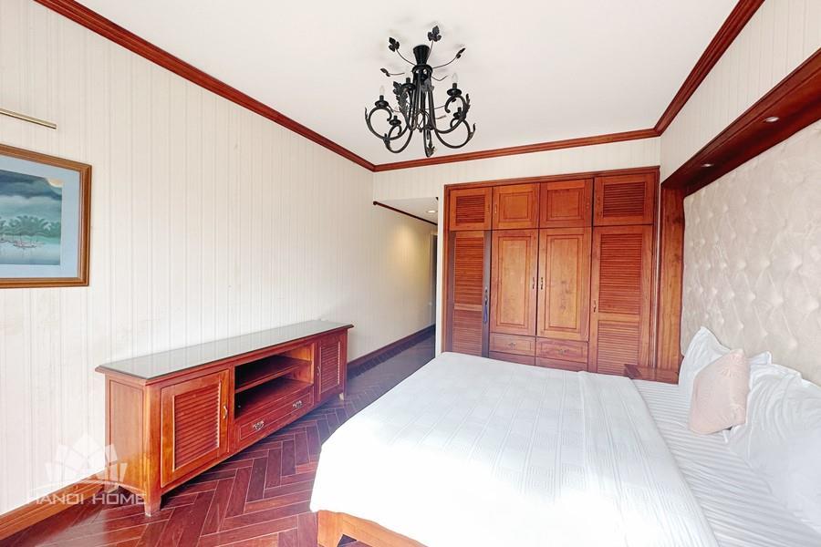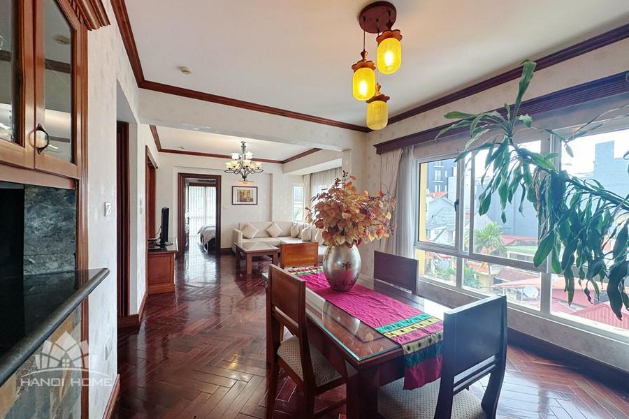 This apartment is located in the sought-after Tay Ho area, offering a breezy living space with warm terracotta tile flooring and elegant natural wood interiors. The open-plan design features a bright living room with a contemporary sofa set, a cozy dining area, and an L-shaped kitchen equipped with wooden cabinetry and modern appliances. The bedrooms feature rich dark wood flooring, a large bed, ample wardrobe space, and air conditioning.