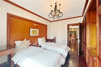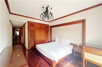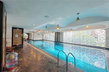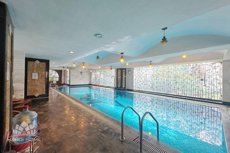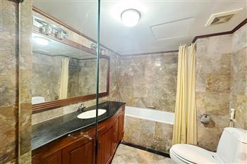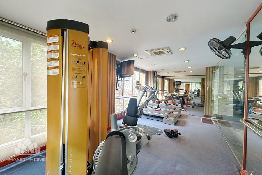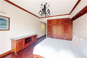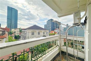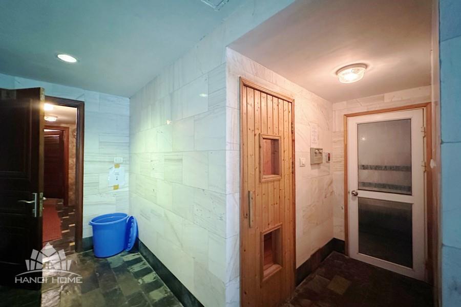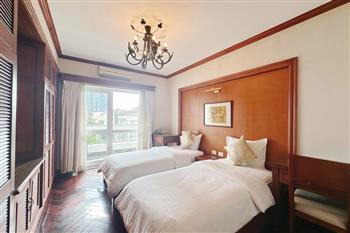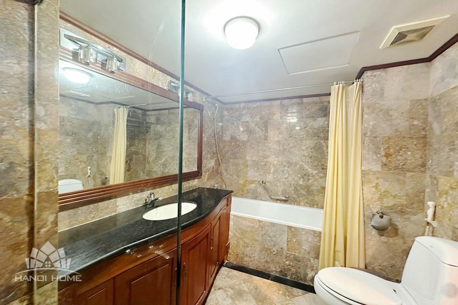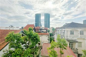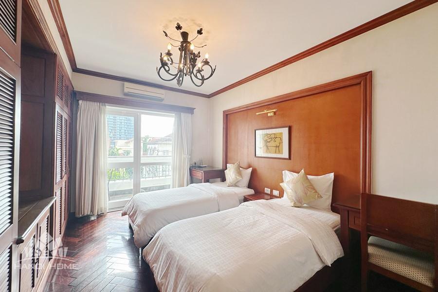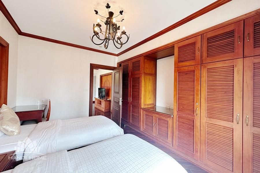 This apartment is located in the sought-after Tay Ho area, offering a breezy living space with warm terracotta tile flooring and elegant natural wood interiors. The open-plan design features a bright living room with a contemporary sofa set, a cozy dining area, and an L-shaped kitchen equipped with wooden cabinetry and modern appliances. The bedrooms feature rich dark wood flooring, a large bed, ample wardrobe space, and air conditioning.