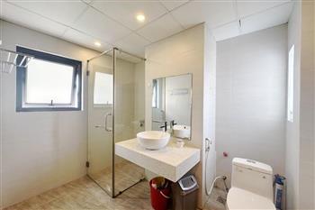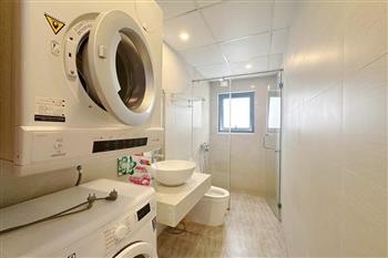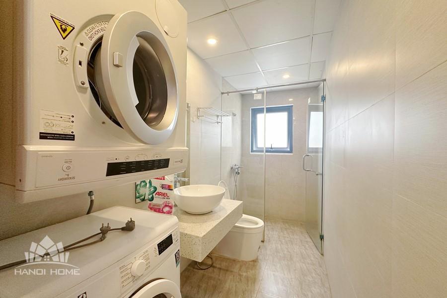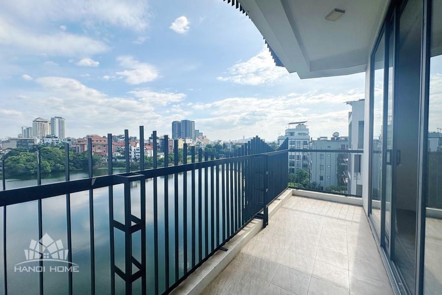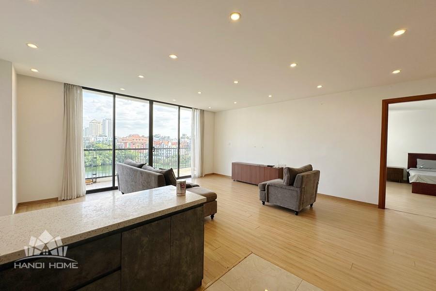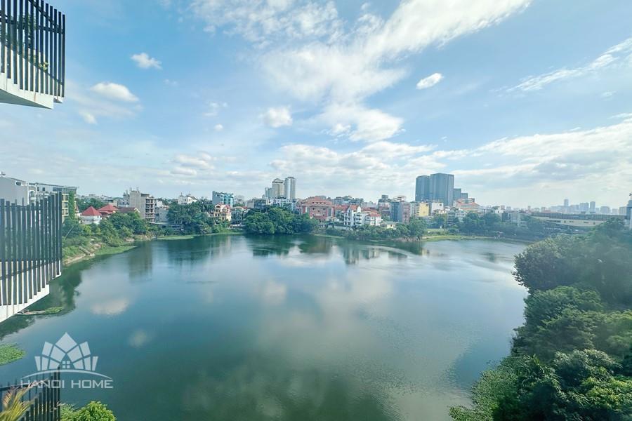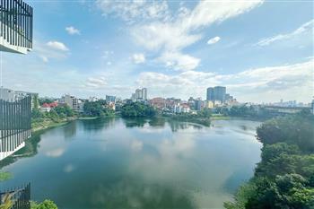 The standout feature is the expansive glass door system and wide balcony, opening up to an unobstructed and stunning West Lake view. The kitchen is designed in a minimalist style with modern industrial grey tones and is fully equipped. Overall, the apartment is a perfect blend of convenient, high-end living and relaxing views by the lake.