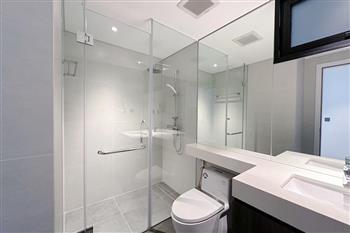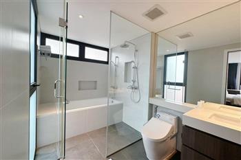 The bathroom is a true retreat, featuring a spacious soaking tub, elegant fixtures, and soft lighting — perfect for relaxing after a long day. Every detail in the apartment has been curated to offer harmony, style, and comfort.