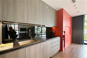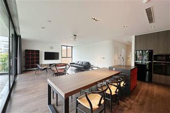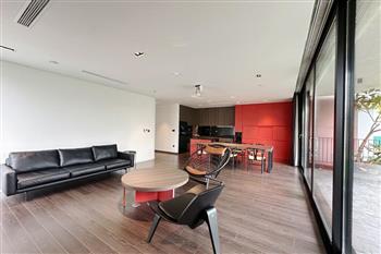 The living area seamlessly connects to a modern kitchen and dining space, all adorned with premium finishes and carefully selected furnishings that reflect a cohesive European-inspired aesthetic. Dark wood flooring, minimalist décor, and high-quality materials create a warm yet sophisticated atmosphere throughout.