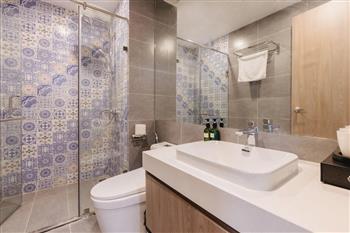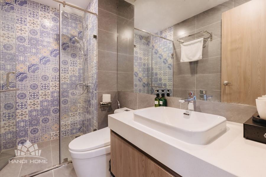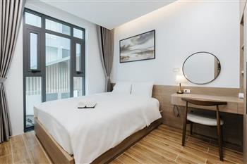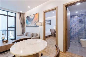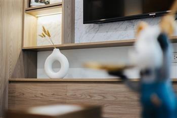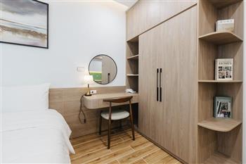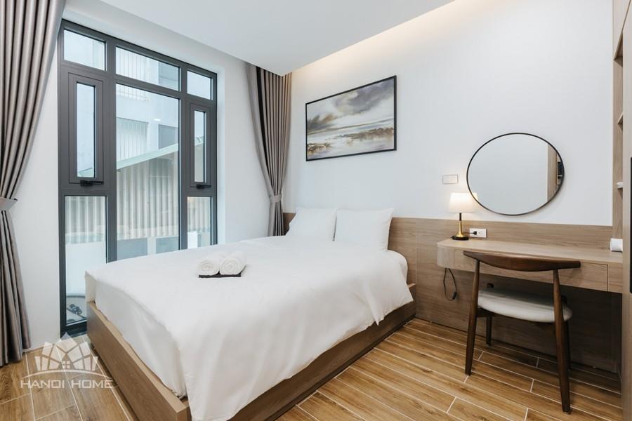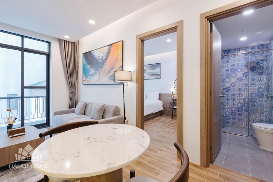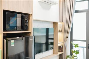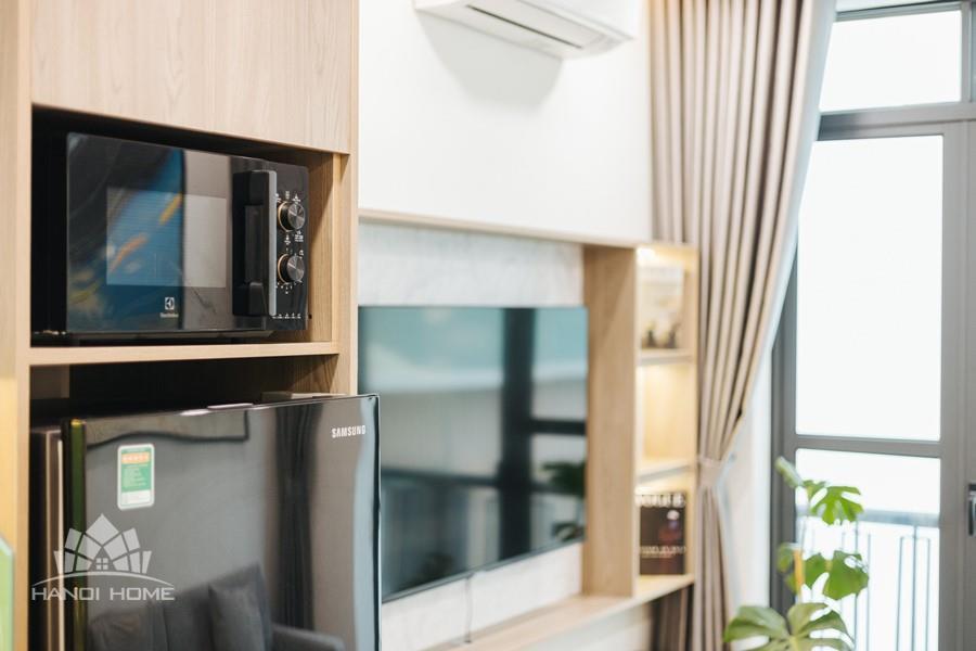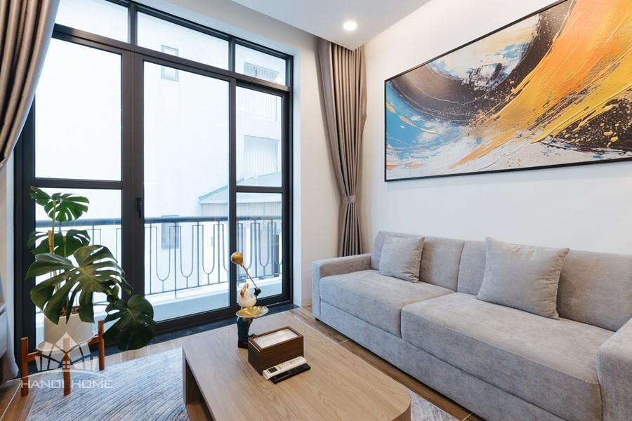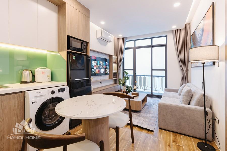 This one-bedroom apartment is a modern and smartly optimized living space, perfectly suited for a dynamic life in the Tay Ho , Hanoi area. The design utilizes an open-plan concept, harmoniously combining the main living area and the kitchen. The apartment features abundant natural light. The interior decor employs a dominant color palette of light wood tones and white, lending it an elegant and cozy appearance, characteristic of Scandinavian or modern minimalist styles.