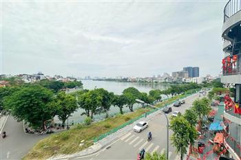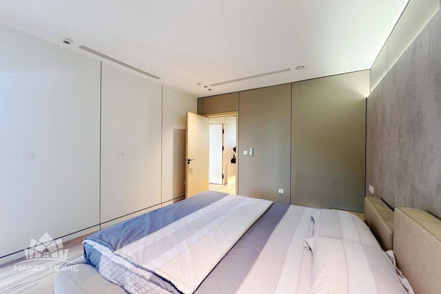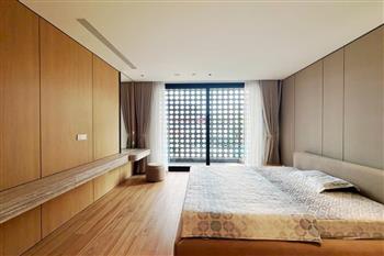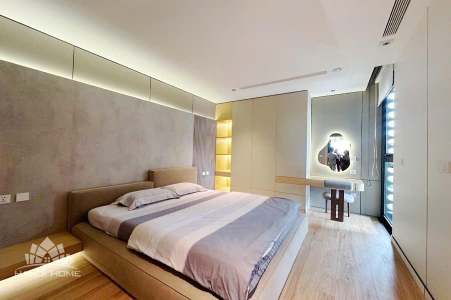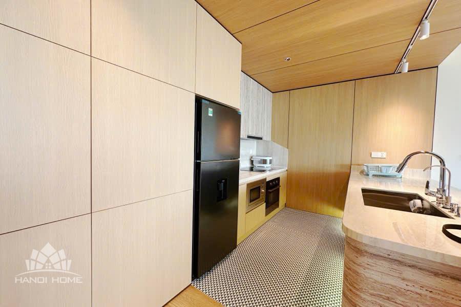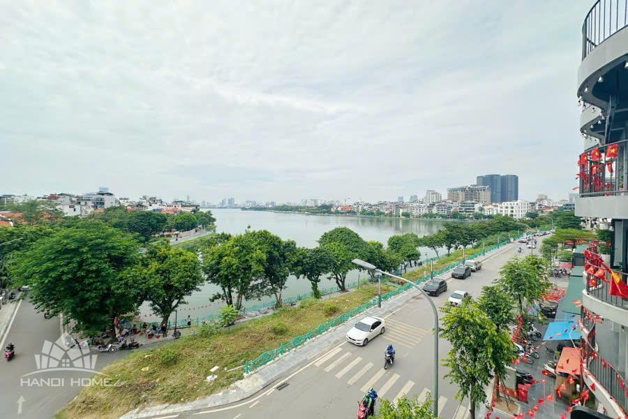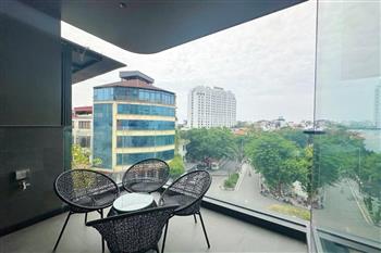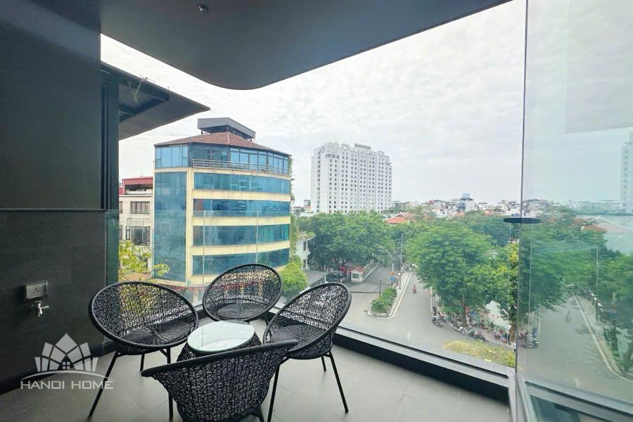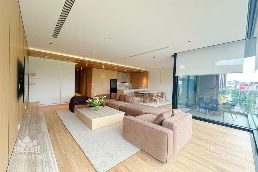 This high-end two-bedroom apartment, situated in a prime location on Xuan Dieu Street, Tay Ho area, offers a luxurious living experience with a Minimalist design approach, featuring a sophisticated blend of light wood and natural stone materials. The unmissable highlight is the unobstructed, direct view of West Lake maximized by floor-to-ceiling glass windows that span the entire open-plan living area, including a small balcony complete with outdoor seating.