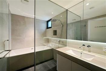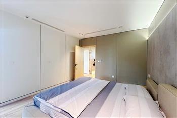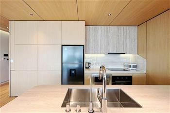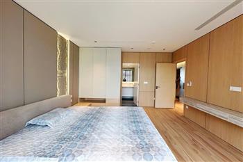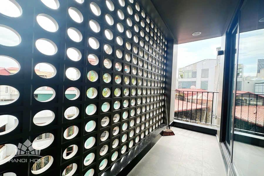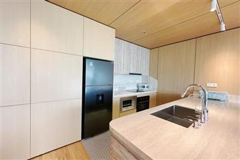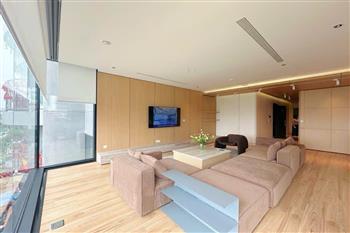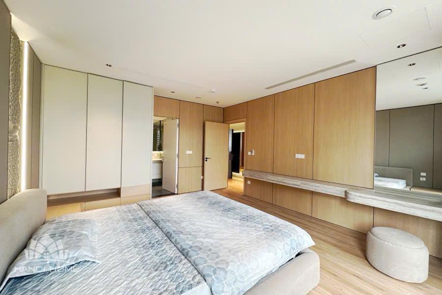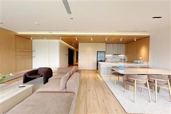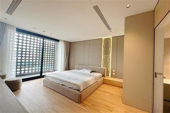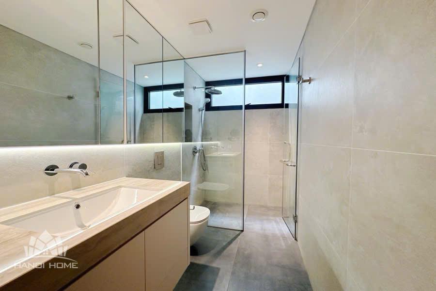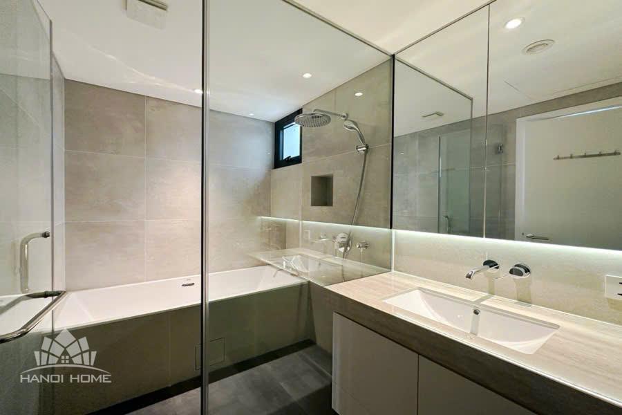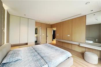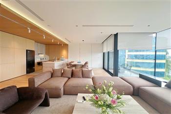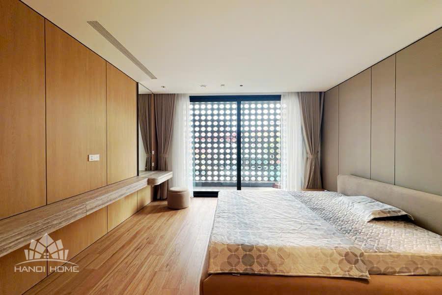 This high-end two-bedroom apartment, situated in a prime location on Xuan Dieu Street, Tay Ho area, offers a luxurious living experience with a Minimalist design approach, featuring a sophisticated blend of light wood and natural stone materials. The unmissable highlight is the unobstructed, direct view of West Lake maximized by floor-to-ceiling glass windows that span the entire open-plan living area, including a small balcony complete with outdoor seating.