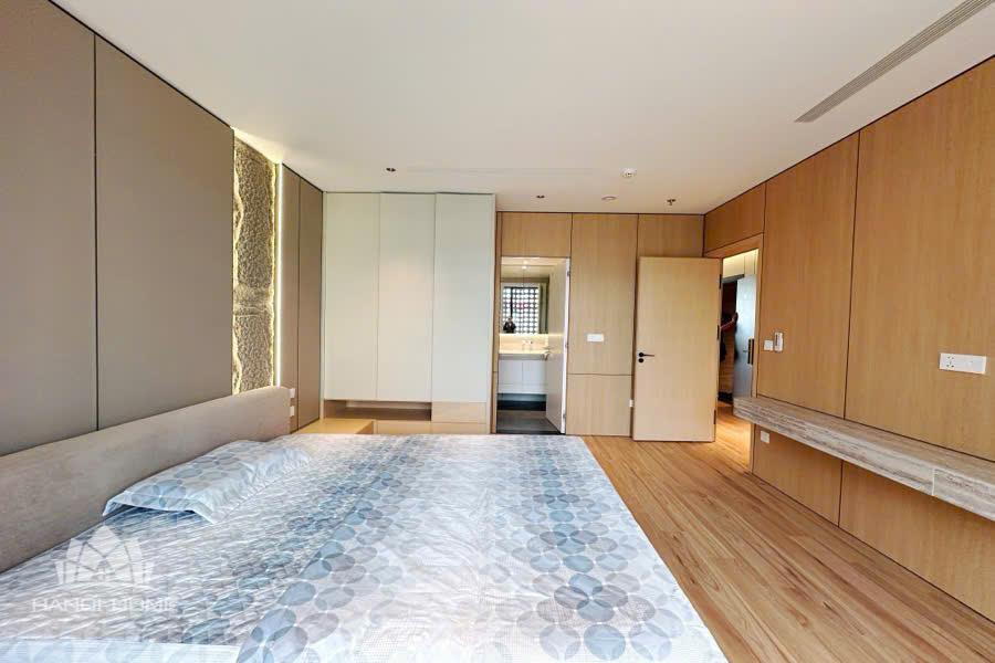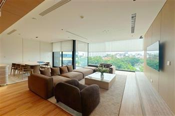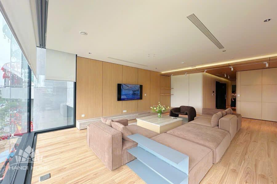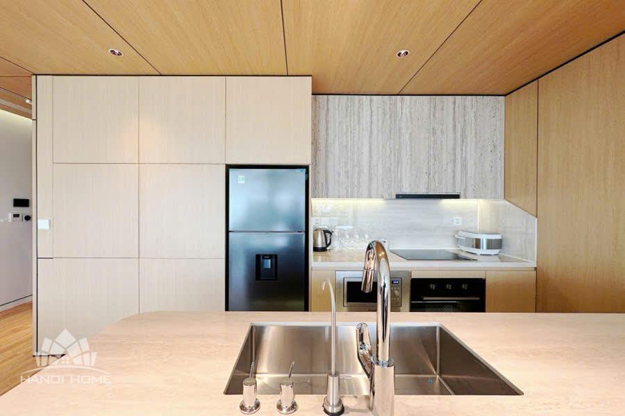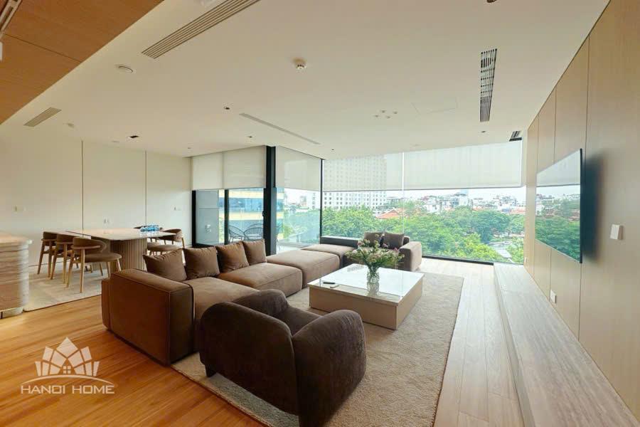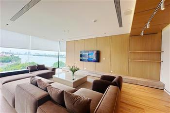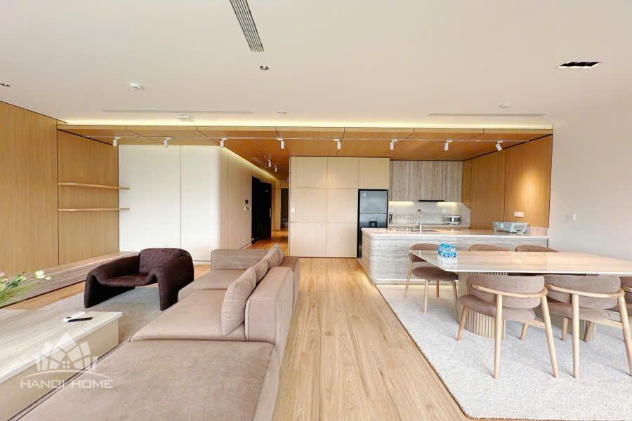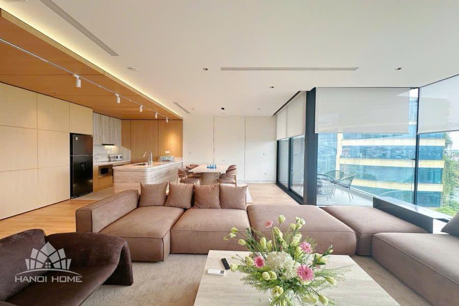 The impressive living room features a large earth-toned brown L-shaped sofa facing an integrated wooden TV wall unit, creating a cozy and modern entertainment space. The open-plan kitchen and dining area stand out with a rounded marble island and a smart integrated kitchen system with floor-to-ceiling cabinetry, ensuring seamless aesthetics. This apartment is the perfect convergence of refined design, cutting-edge amenities, and an unparalleled lake view, ideal for tenants seeking luxury and privacy in Tay Ho.