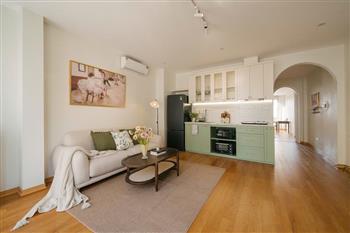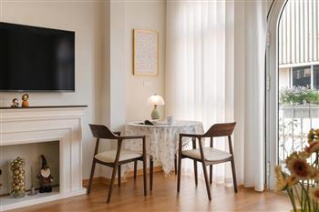 • Size: 80m², 1 bedroom • Amenities: Fully equipped kitchen, cozy living room with soft sofa and decorative fireplace. • Private rooftop with panoramic city view, ideal for relaxation.