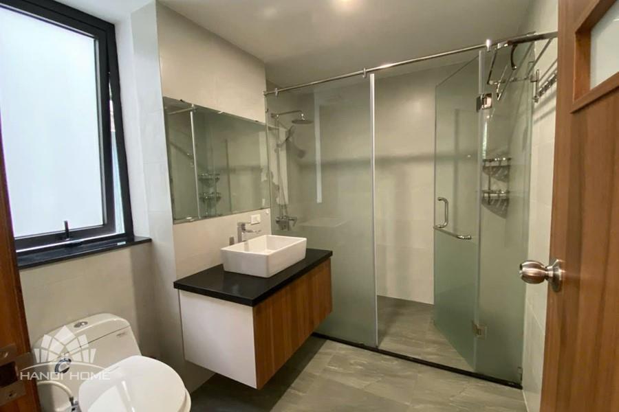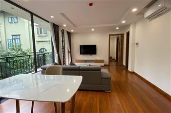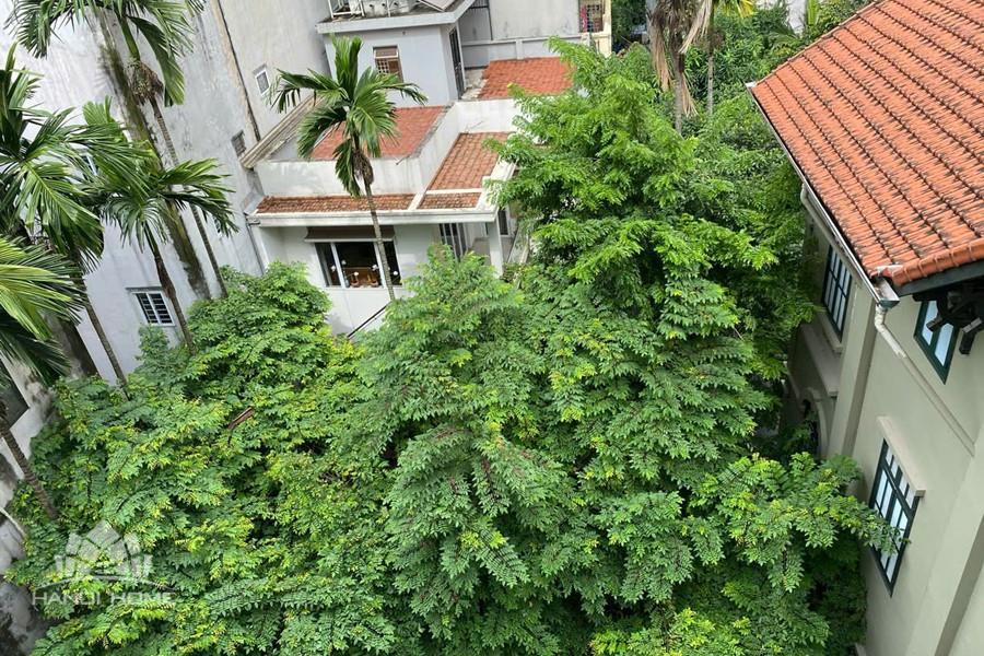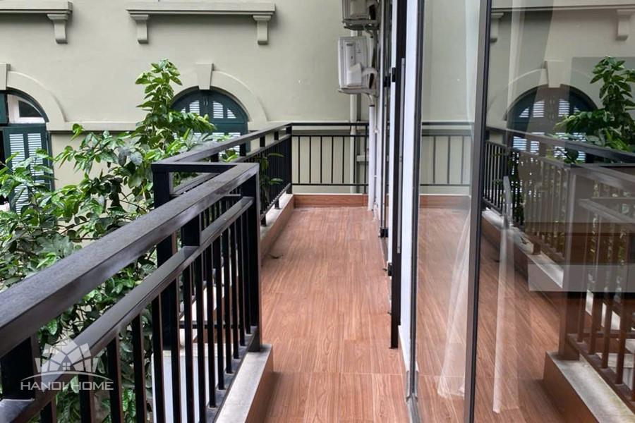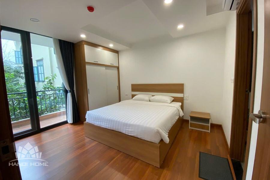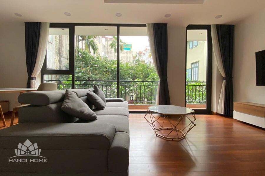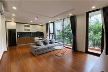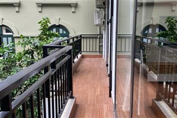 This 1-bedroom apartment in Đặng Thai Mai, Tây Hồ, stands out with its modern design and maximum natural light. Warm red-brown wooden flooring runs throughout the unit. The living room and kitchen areas are open-plan, highlighted by floor-to-ceiling glass doors and a large balcony, which provides green views and an airy atmosphere.