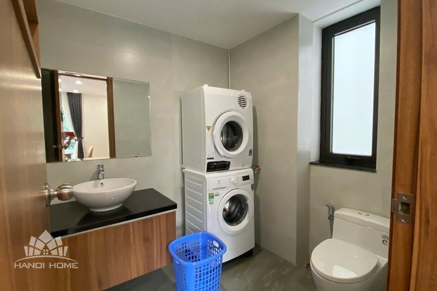 The living area features a gray sectional sofa and a geometric coffee table, while the kitchen is fully equipped with a black refrigerator, induction hob, and a white marble dining table. The bedroom is bright and spacious, featuring a large two-toned built-in wardrobe and balcony access. The modern bathroom has a walk-in shower separated by a tempered glass screen, and the apartment also includes a dedicated laundry area with a stacked washer and dryer, making it highly convenient for daily life in Tây Hồ.