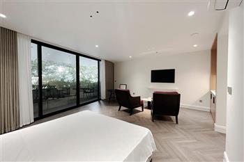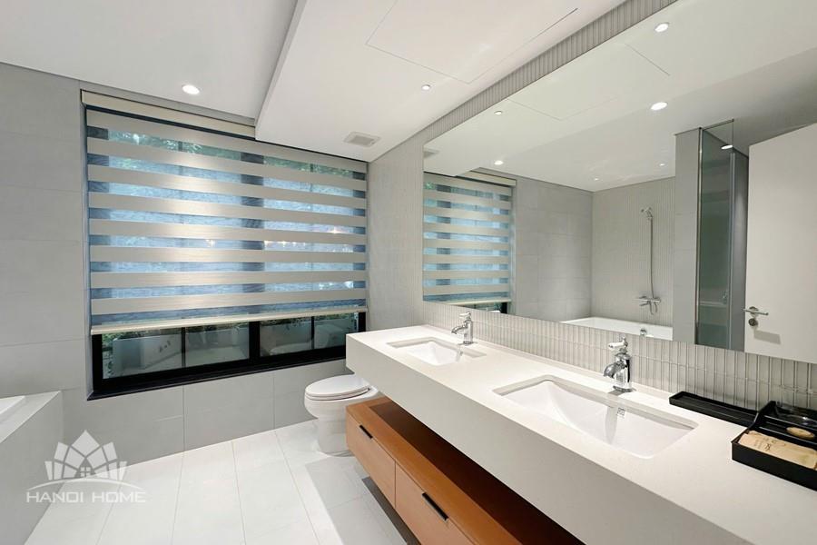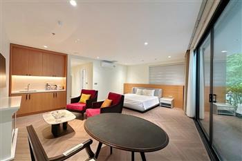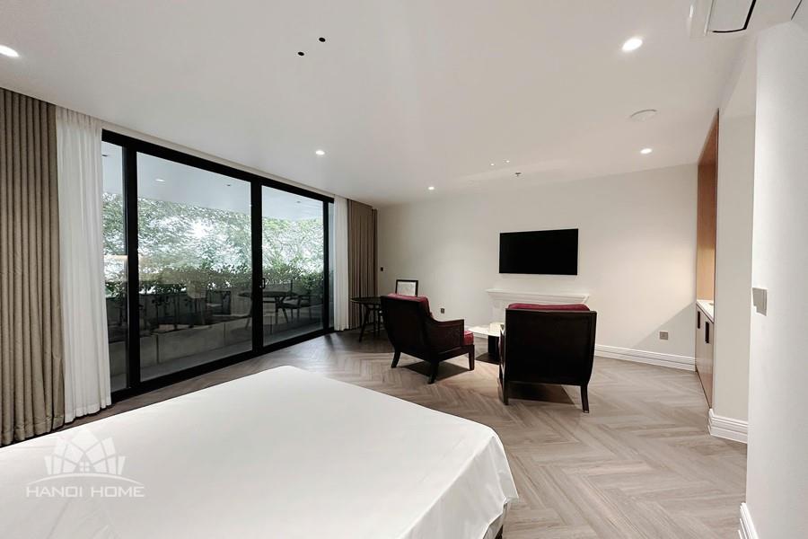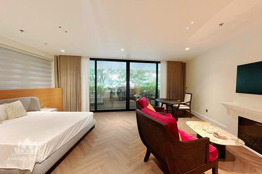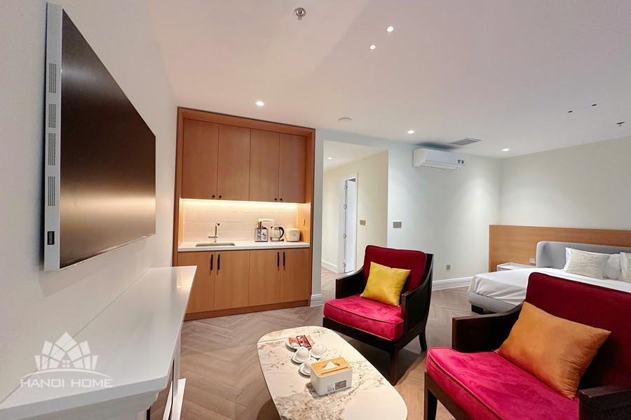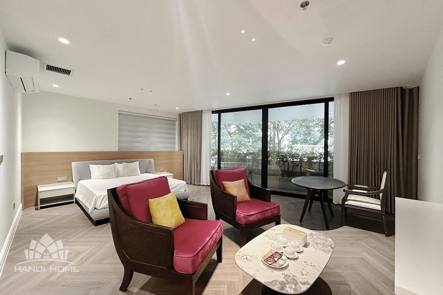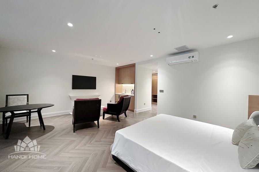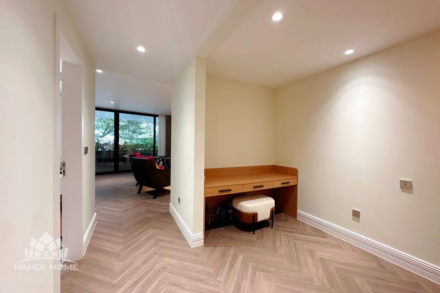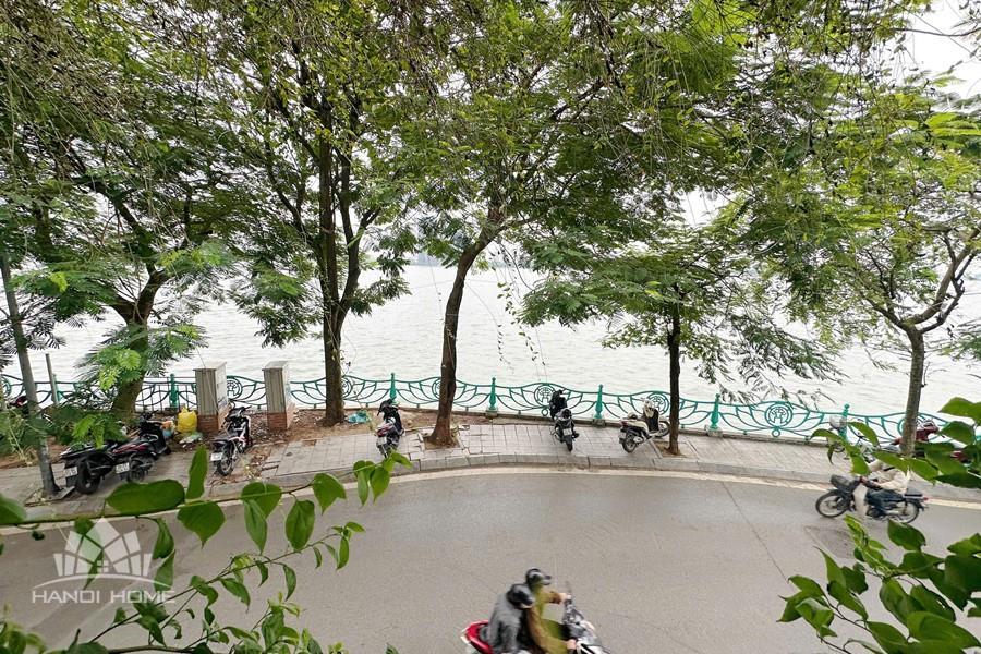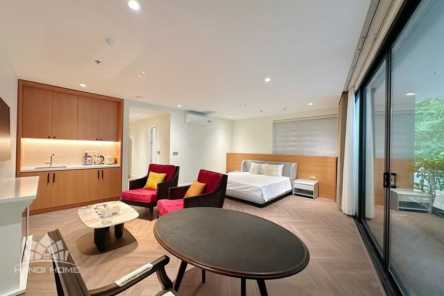 The studio apartment in Ve Ho, Tay Ho offers an ideal living space for those who appreciate tranquility and the natural beauty of West Lake. Located right by the lakeside, the apartment boasts a wide, unobstructed view, allowing you to take in the shimmering water and lush greenery every day. Its modern design is complemented by fully equipped, contemporary furnishings. A spacious balcony adorned with greenery provides a relaxing atmosphere—perfect for enjoying tea or reading in the gentle morning sunlight. The herringbone-patterned wooden flooring, combined with natural light streaming through large glass doors, creates a cozy and elegant ambiance. This is a perfect choice for expats, young couples, or anyone seeking a comfortable home that blends modern convenience with nature in the heart of Hanoi.