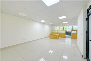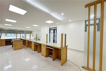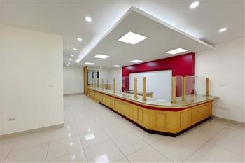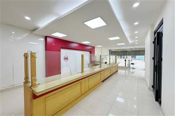 A major advantage of this property is its open design and near-complete interior setup, allowing for immediate business operations with minimal renovation investment. The interior space is airy and bright, featuring clean, glossy white tile flooring, standard gypsum ceilings, and a modern recessed lighting system that provides excellent illumination for the entire workspace. The flexible layout on each floor allows for easy division into various functional zones. Critically, the ground floor is already equipped with a long, professional reception/transaction counter featuring glass dividers and light-colored wooden furnishings, making it perfect for banks, transaction centers, or customer-facing offices.