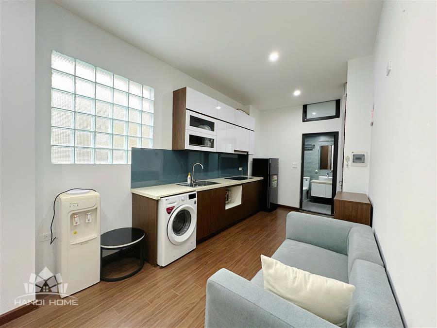 This modern studio apartment on Xuan Dieu Street offers a cozy yet functional living space, perfect for individuals or couples seeking comfort and convenience in the heart of the city. The thoughtfully designed layout maximizes space efficiency, seamlessly combining the sleeping, lounging, and dining areas into one harmonious environment. Large windows allow an abundance of natural light to flood in, creating a bright and airy ambiance that enhances the apartment’s welcoming atmosphere.