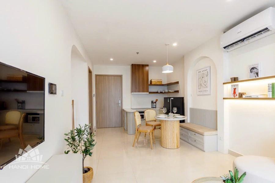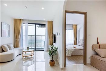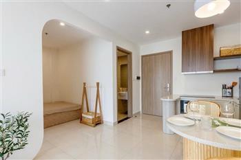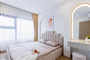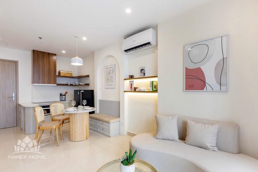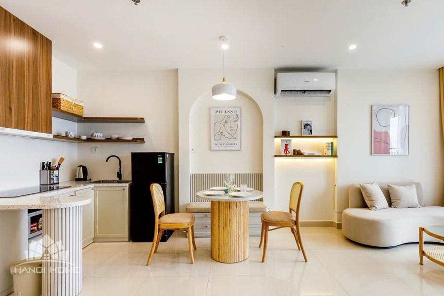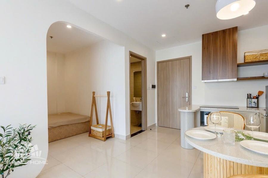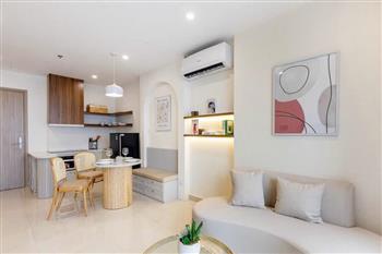 Inside, the apartment is thoughtfully designed in a modern and minimalist style, combining soft beige tones with natural wood finishes to create a cozy and elegant atmosphere. The open-plan living and kitchen area is bright and spacious, filled with natural light.The apartment comes fully furnished with high-quality interiors, including a stylish sofa, wooden dining set, well-equipped kitchen, comfortable bed with mattress, dressing table, and air conditioning — ready for you to move in immediately. Every detail has been carefully curated to provide both comfort and aesthetic appeal.